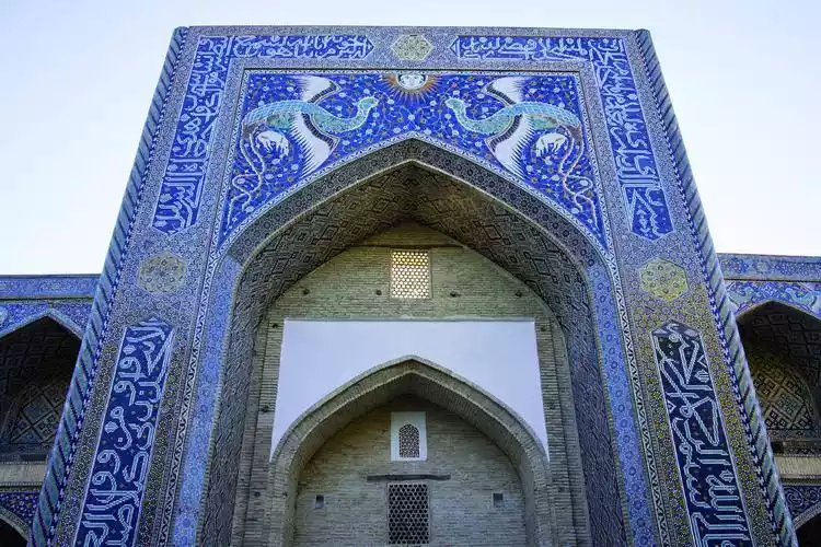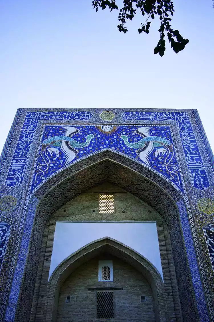 Not far from the statue is the Nadir Diwan Beghi Madrasah, with its bold architectural style. Looking up, one can easily spot that the exterior tiles of this Madrasah are distinctly different from those found elsewhere, featuring peacocks, lambs, and human faces. This is a direct violation of the Islamic prohibition against depicting living things, and is quite rare. You can also find this phenomenon in Samarkand.