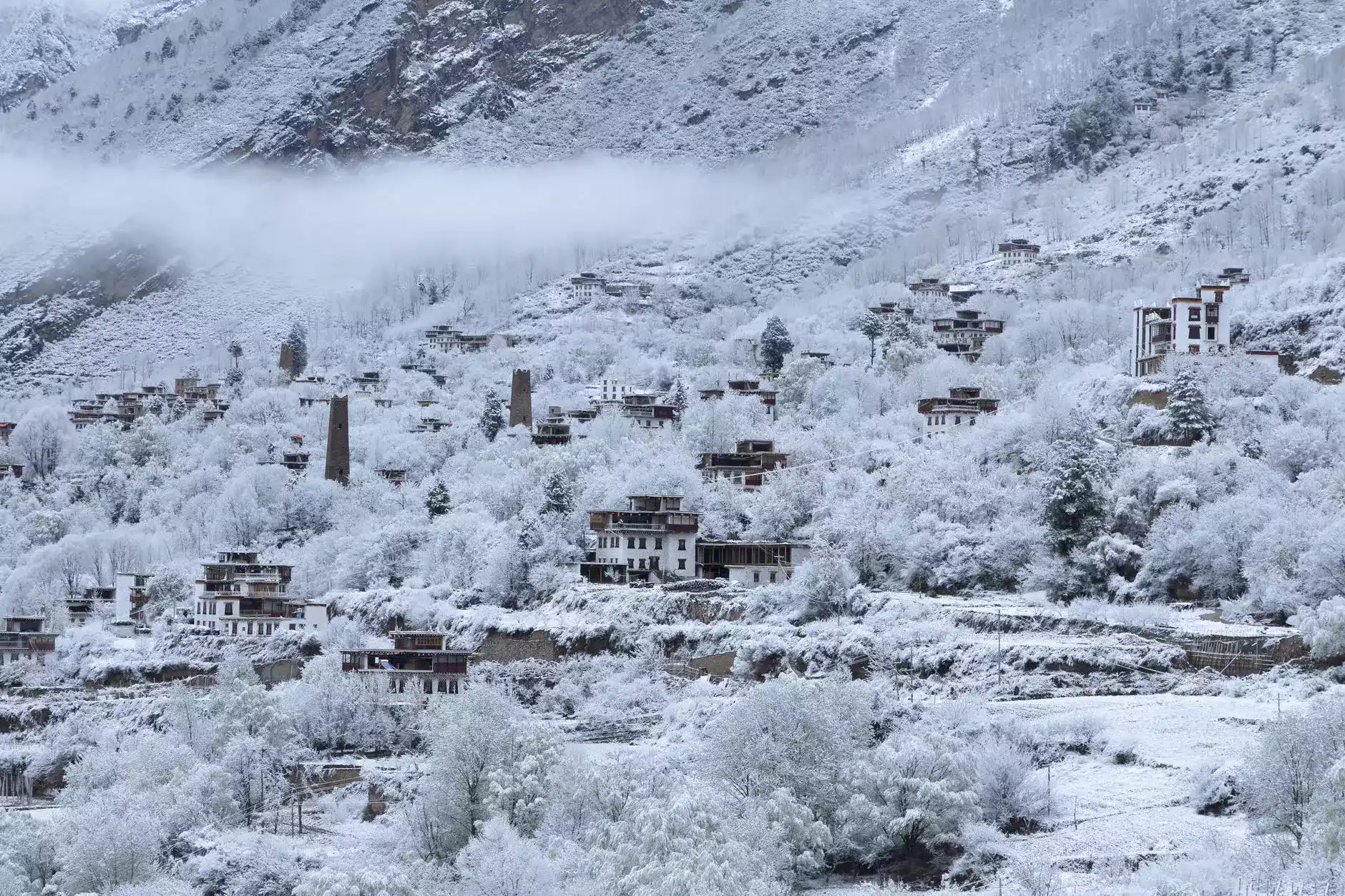 Danba Tibetan Village was once praised as the "most beautiful village" by National Geographic. In spring, the mountains are covered with pear blossoms, in autumn, the forests are colorful, and in winter, heavy snow falls. The colors of the ancient castles and watchtowers are even more vivid, just like a kingdom of ice and snow.