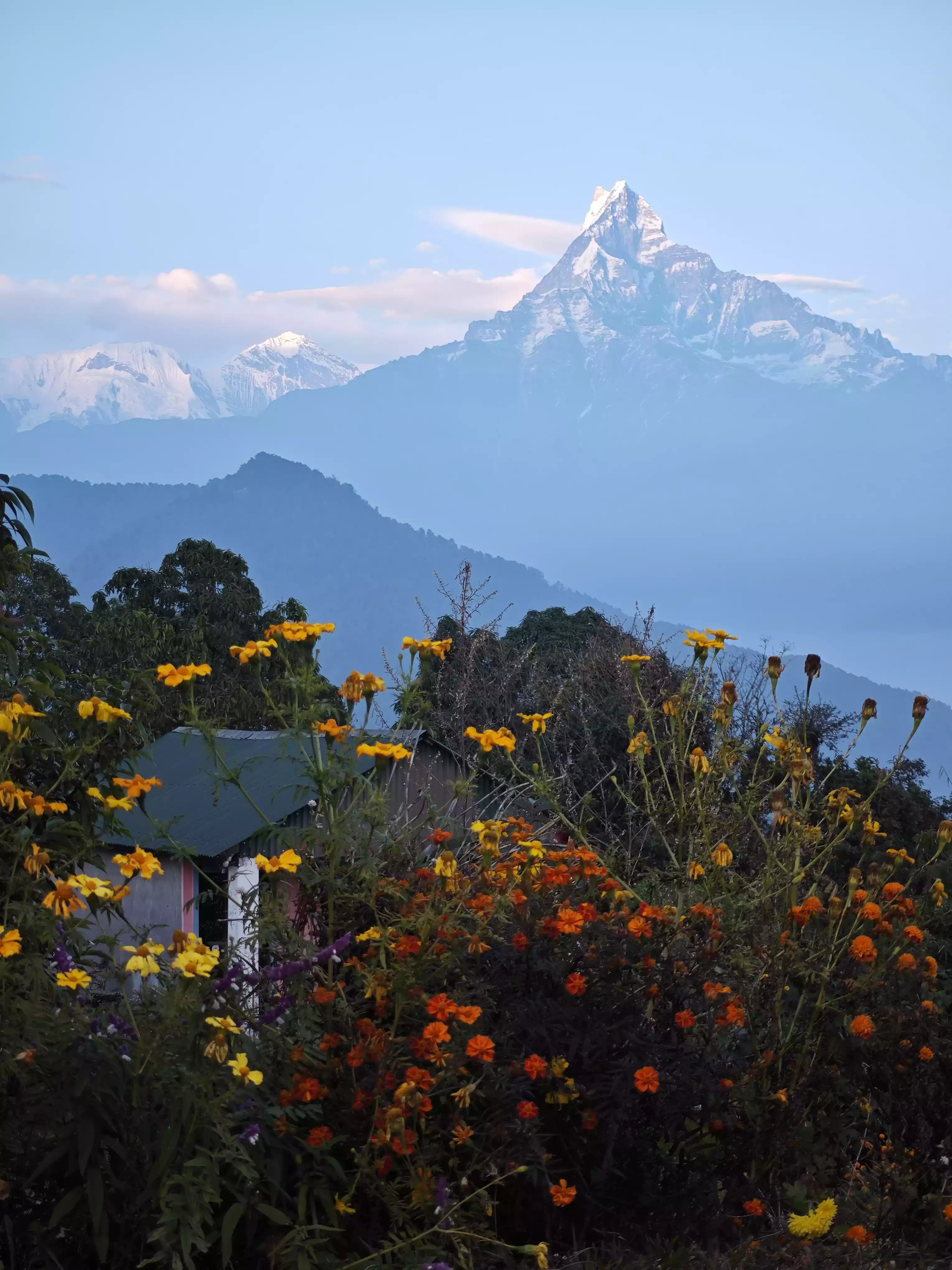 360° snow-capped mountains are within reach, and what you see is the ceiling-level scenery, forest meadows, snow-capped mountains, canyon waterfalls, streams, etc., the closest view of Fishtail Peak and Annapurna