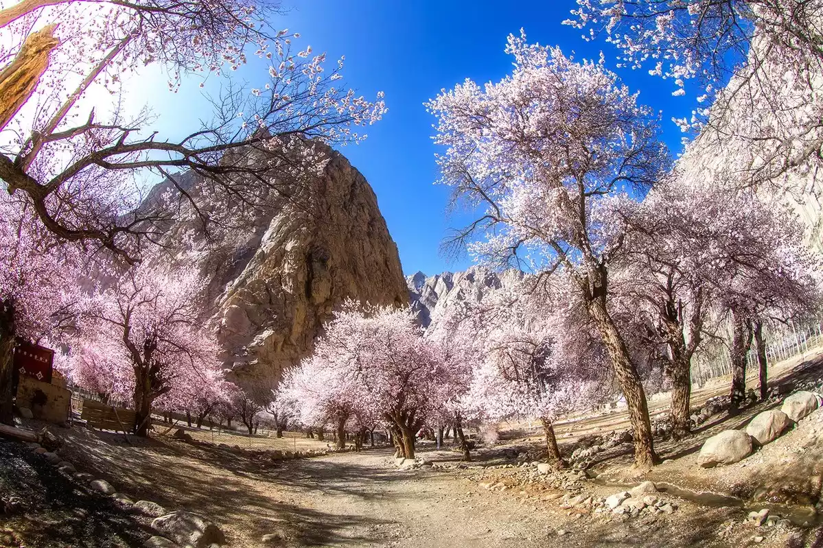 The apricot blossoms of southern Xinjiang possess a nearly tragically gorgeous beauty! They struggle from the barren plateau, their gnarled branches brimming with blood, and beneath the gaze of Muztagh Ata, they scatter their petals toward the surging Yarkand River. When a stubborn pink-white tree emerges from a landslide rubble, you understand: the apricot blossoms of the Pamirs aren't just a spectacle, but a declaration of survival.