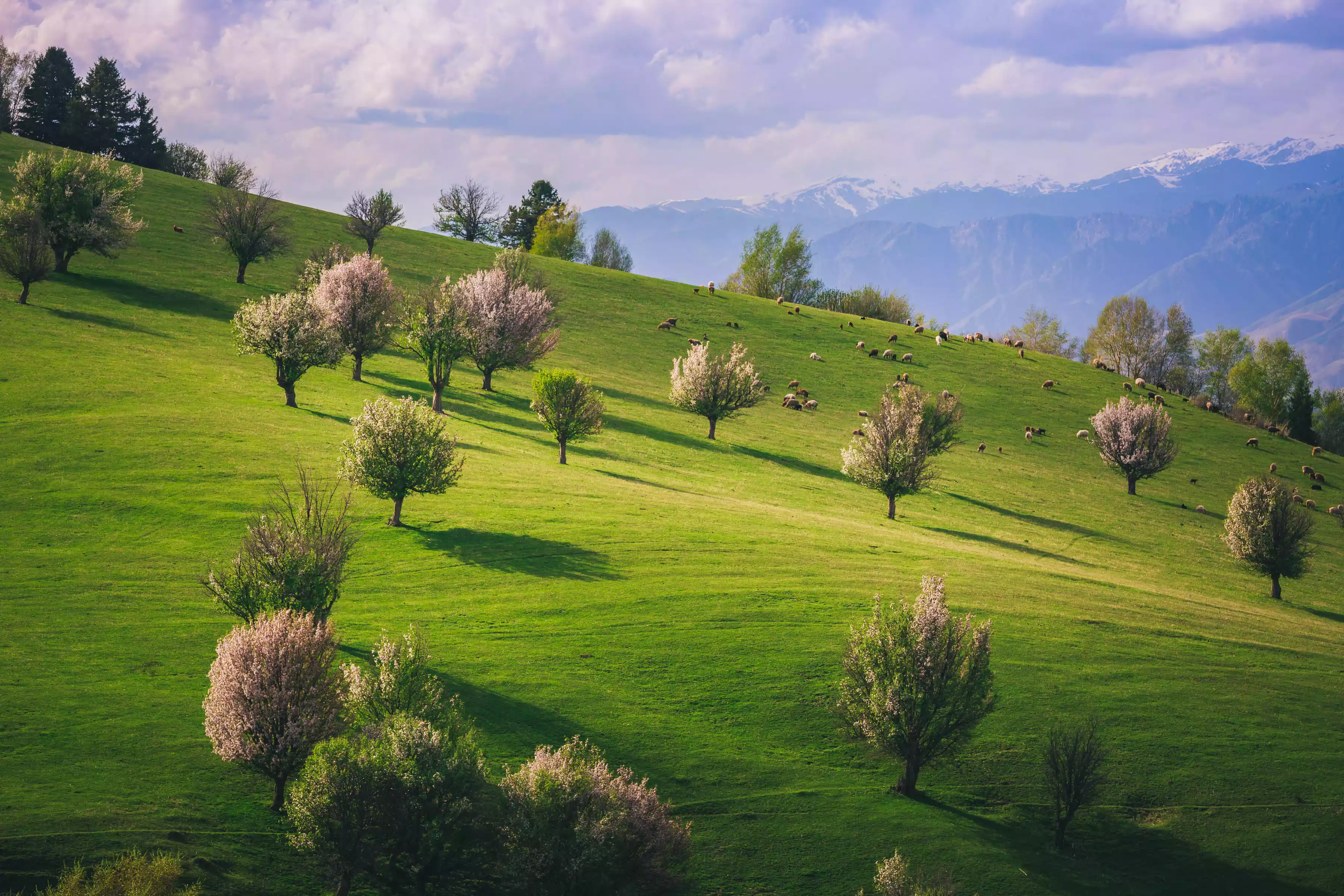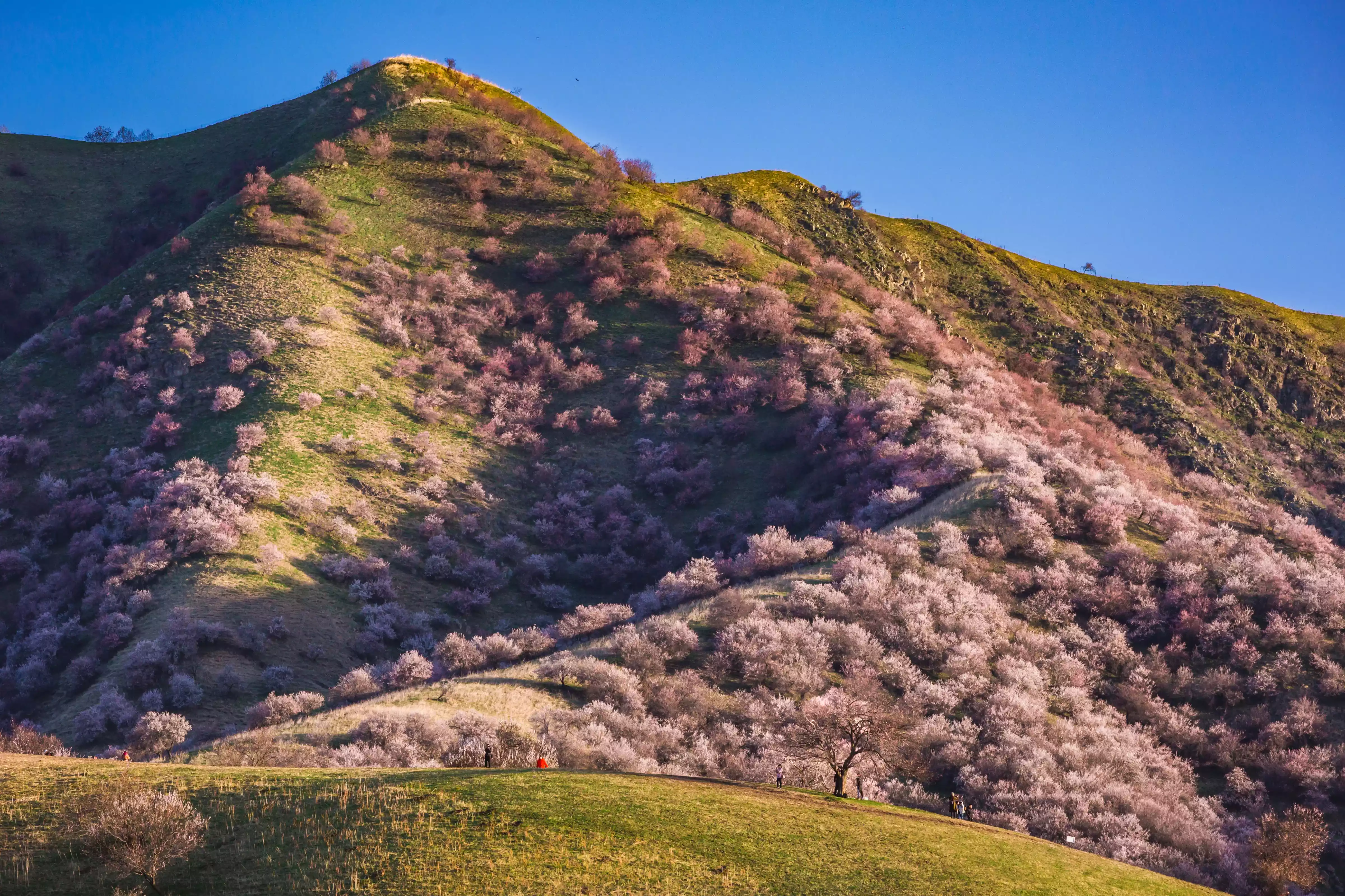 A Kazakh boy on horseback will teach you to identify the various varieties of apricot blossoms: those on the south-facing slopes glow red, while those in the shade are almost icy white. The trails trampled through the grass by migrating sheep unexpectedly match the contour lines of the mountain.