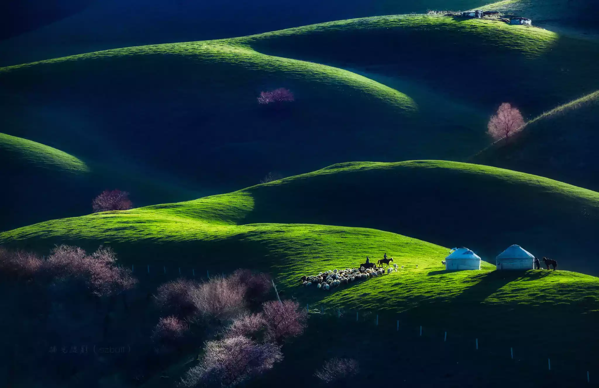 When spring light climbs up the ridge of Tianshan Mountains, I always suspect that the Creator has secretly hidden another calendar in Xinjiang - when the peach blossoms in the south of the Yangtze River have faded and turned into spring mud, the wind here slowly unties the first button of the snow-capped mountains.