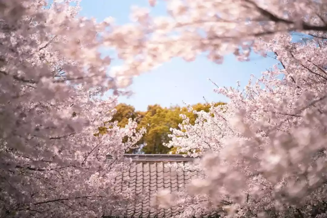 Frame composition: Use surrounding door frames, window frames, tree branches, etc. as frames to frame the cherry blossoms, adding layering and interest to the picture.