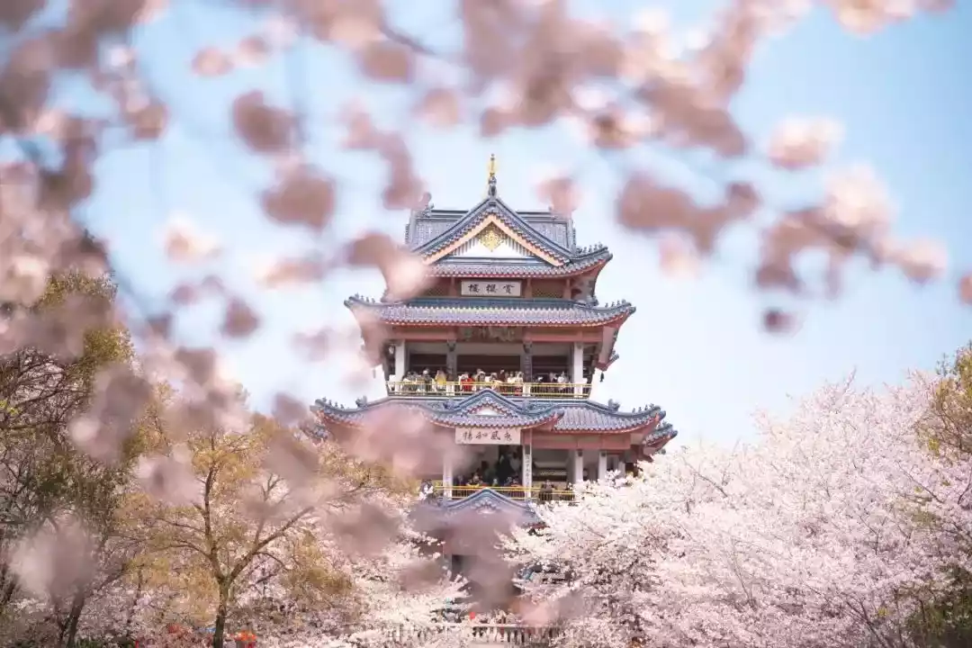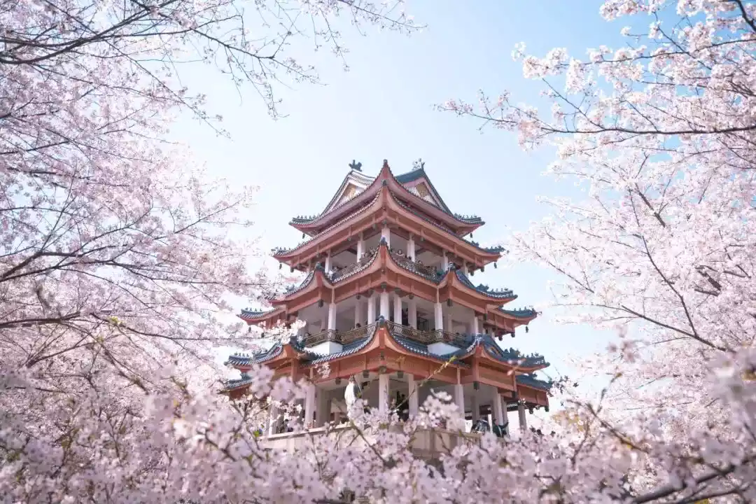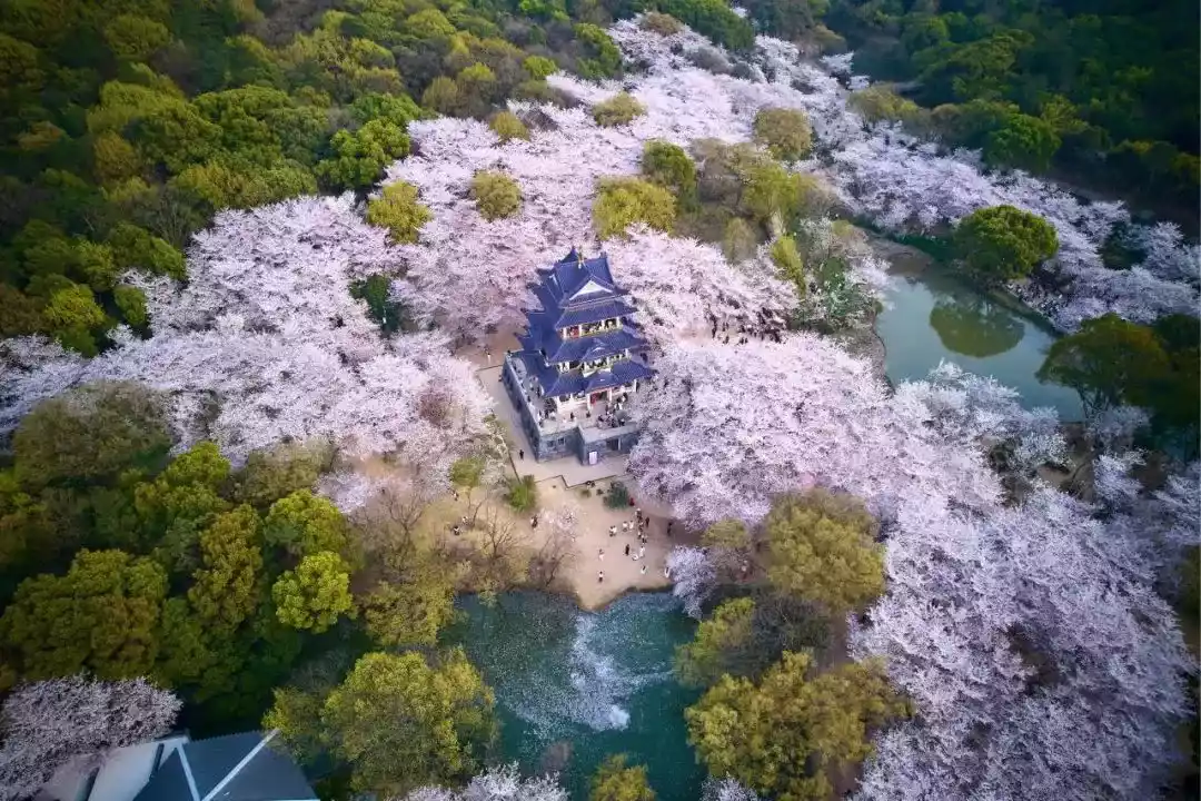 Want an even more stunning perspective? Standing high on Luding Mountain, you can take in the vast expanse of cherry blossoms and the stunning scenery of lakes and mountains. The perfect fusion of nature and humanity is a true visual feast.
