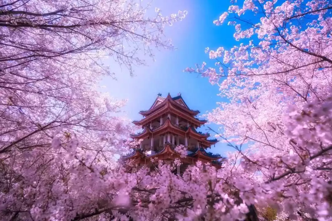 High-angle aerial photography: Find a high shooting point, such as a cherry blossom viewing building. The aerial photography can show the panoramic view of the large cherry blossoms and the surrounding buildings and lakes, enriching the picture layering.