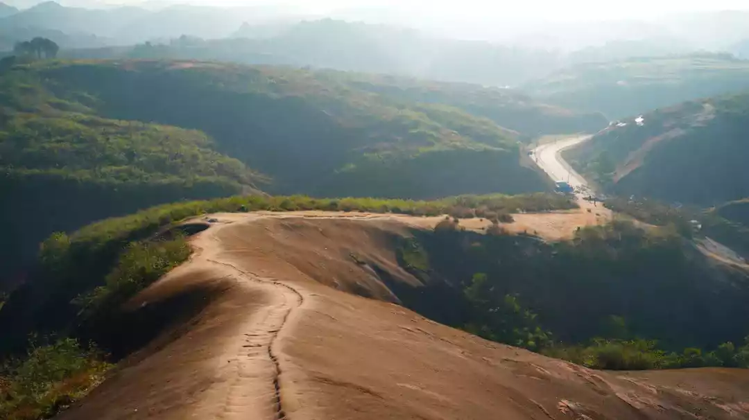 The Danxia landform at Mahuangqiu is different from the God's perspective at Gaoyiling. The Danxia landform here is more gentle. Going up the ancient stone steps left over from hundreds of years ago, you can reach Epo Village on the top of the mountain and overlook Chenzhou's most beautiful Danxia Highway No. 66.
