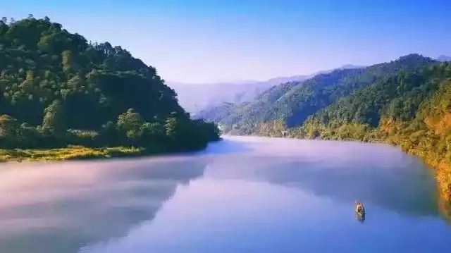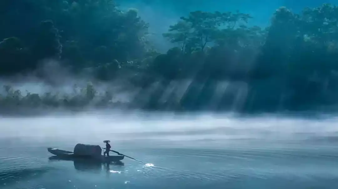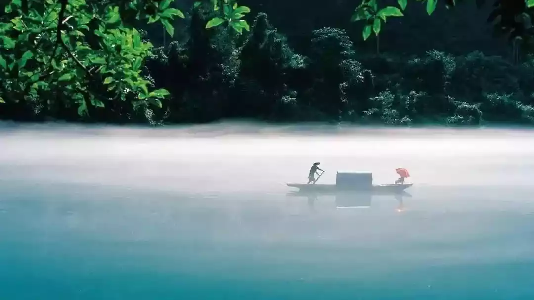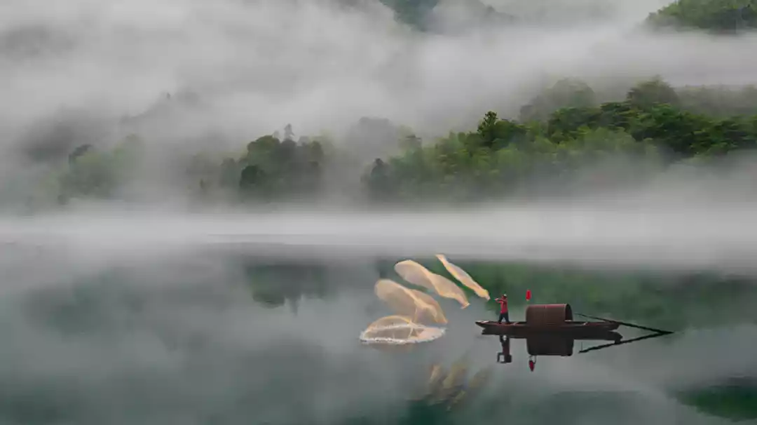 There is a small black-sailed boat in the river fog. The fisherman is rowing the boat, moving slowly forward in the fog, spreading out a fishing net. You can get a landscape painting with your eyes!