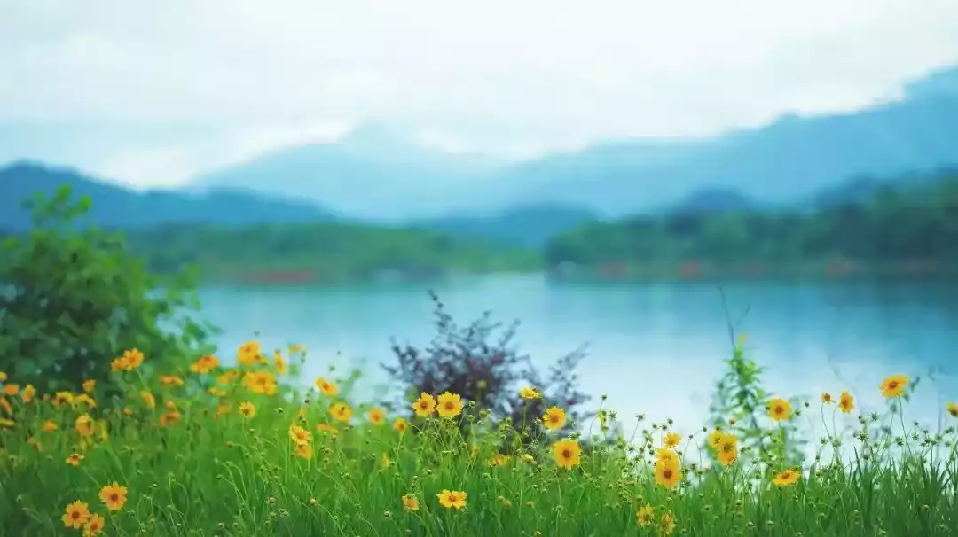 The small yellow flowers growing along the lake are dotted with stars, and when the weather is good, the lake water is incredibly blue.