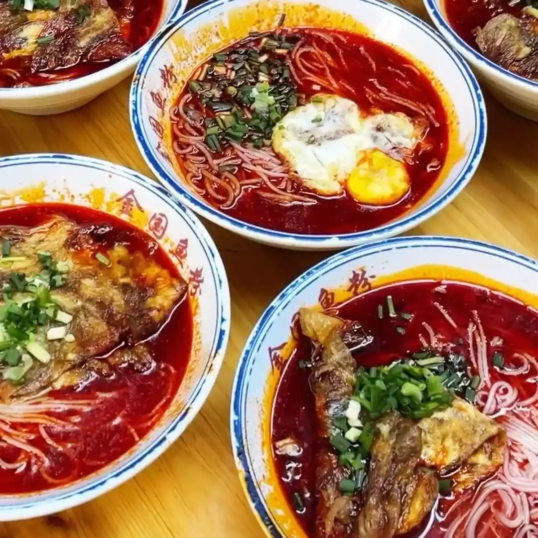 Use fresh silver carp to make fish soup, add chewy dry-cut vermicelli, and then add chili powder. The fish powder just out of the pot is covered with a layer of red chili oil, which is so delicious that you can't stop eating it.