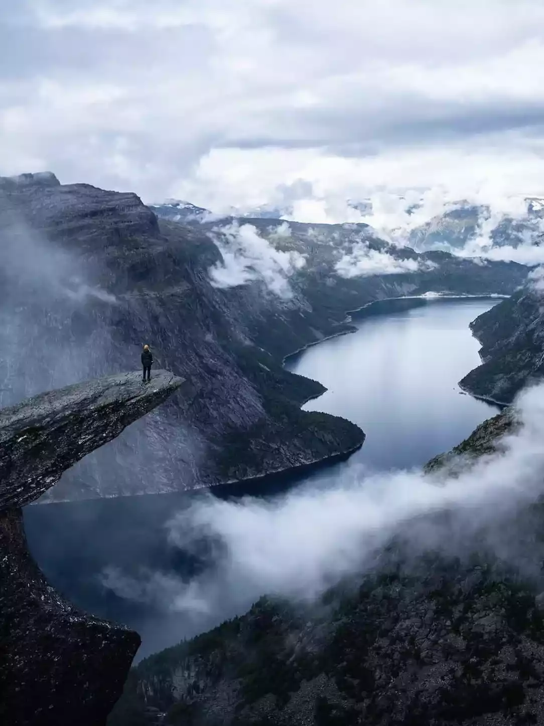 If you want to experience the essence of fjord landscapes, head to Norway! Norway's three most remarkable rocks are the Pulpit Rock, with its 604-meter vertical drop to the Lysefjord; the Miracle Rock, suspended a thousand meters below the surface, with just one cubic meter of rock wedged between two cliffs. Standing on the rock for photos requires courage; and the Devil's Tongue, with its 11-meter-long protrusion into the lake.