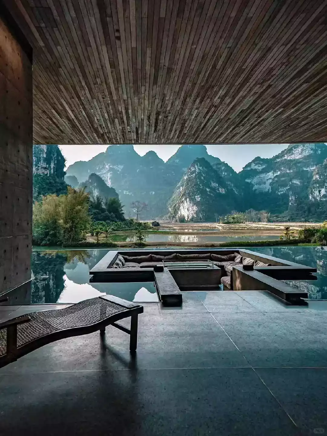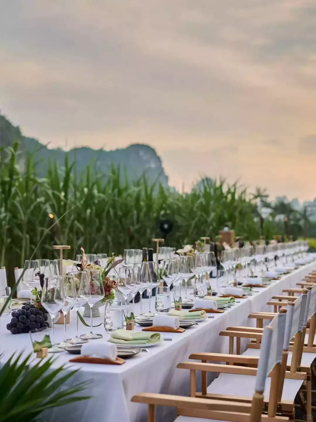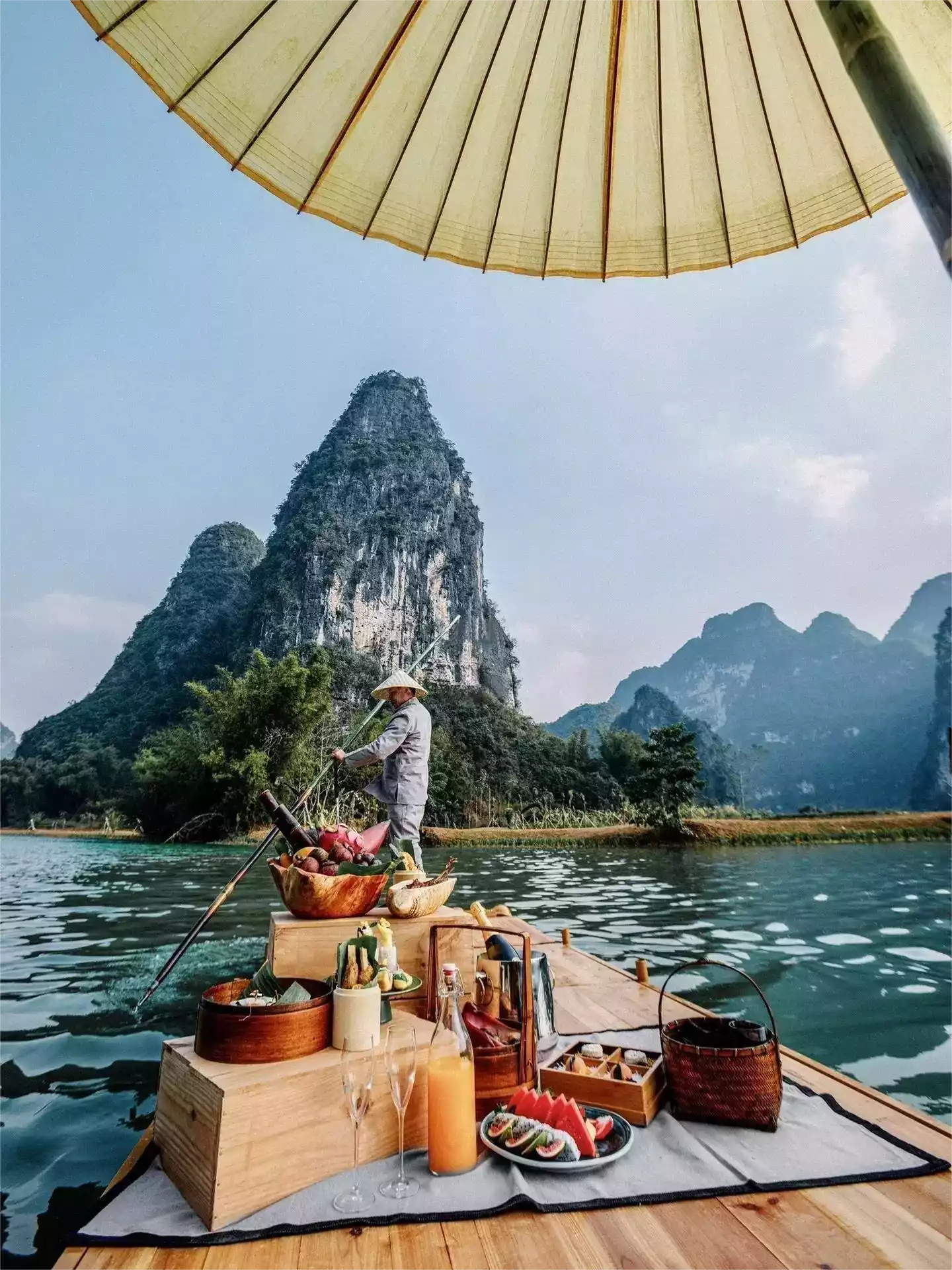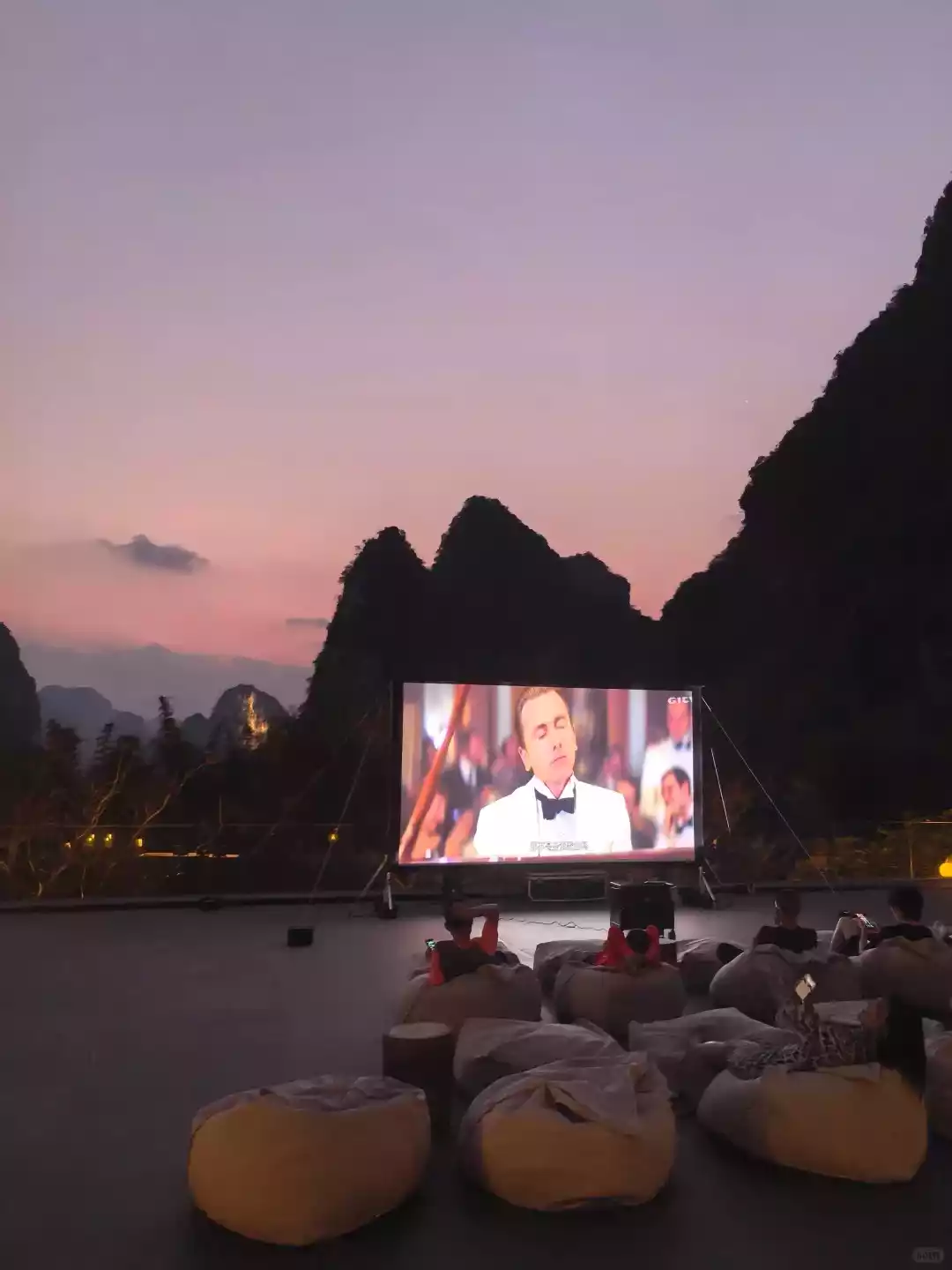 . At sunset, a long table by the pool was set for a "Starlight Dinner." Freshly caught river fish simmered in a sour fish soup pot, accompanied by freshly picked asparagus from the afternoon. After three rounds of drinks, a Zhuang singer played the lyre and sang the epic creation poem in the ancient Zhuang language. Looking up, the Milky Way stretched across the karst peaks of China and Vietnam. After dinner, an open-air film screened, interwoven with the natural landscape. Classic film monologues seemed imprinted on the peaks, becoming a poetic expression.