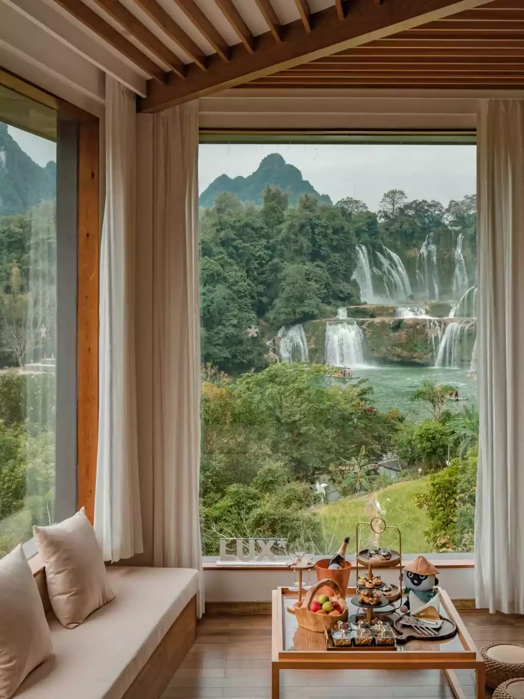 At 2:00 PM, cycle to the hotel's private waterfall. Mountain bikes are available, allowing you to ride along rice paddy paths, weaving through Zhuang villages and sugarcane fields. Passing by the Mingshi Rural Observation Deck, you can capture the stunning morning light bathing the peaks. Your guide will explain local farming culture, and you'll cycle to the hotel's private waterfall. Cycling along the leaf-strewn path might even startle a group of macaques grazing on wild fruit. For a relaxing getaway, try rafting on the Black Water River. The hotel's bamboo raft afternoon tea is incredibly chill!