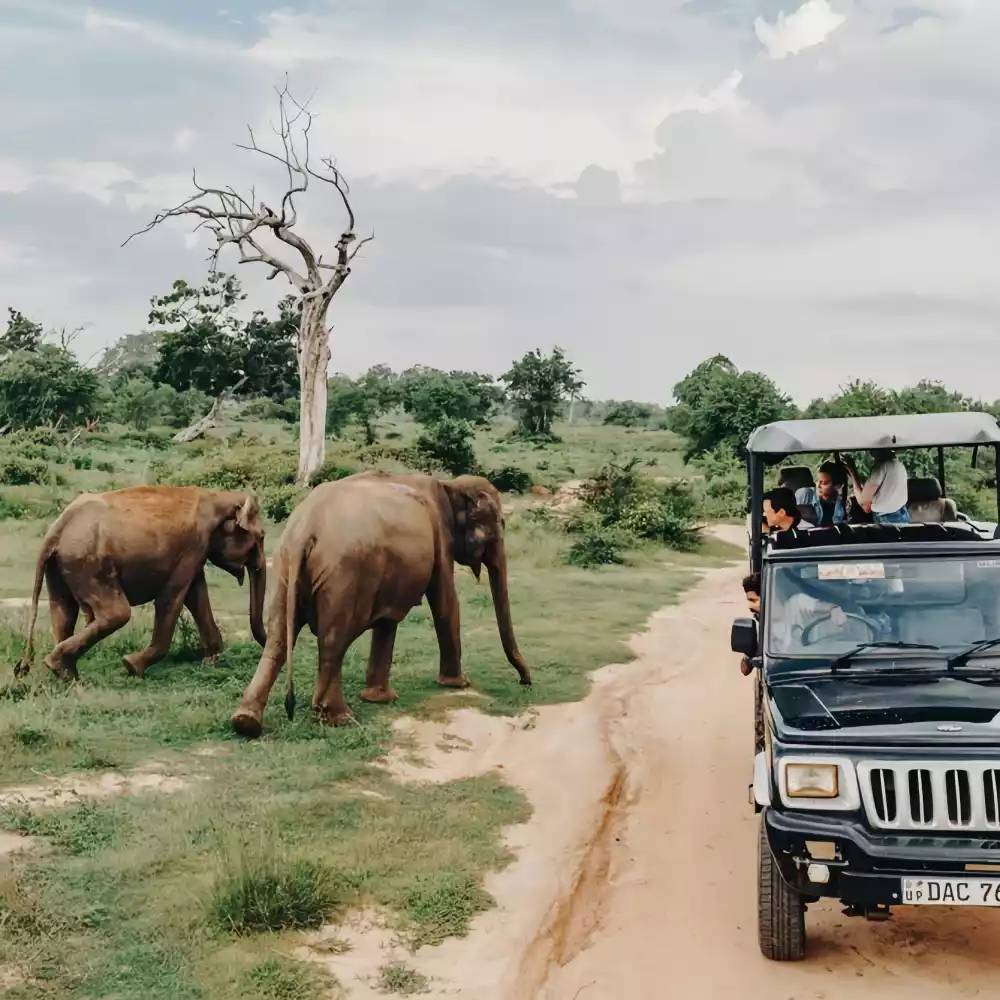 Daily life at the hotel began in the morning mist. The sky was still gray as the jeep set off, tumbling through the dew. The roar of the engine startled a few early birds, which fluttered over the treetops, partially obscuring the silhouettes of wildebeests. They lowered their heads to nibble on the dewy grass, their horns adorned with glistening water droplets. A rustling sound came from the distance: a few peacocks paced, their tail feathers casting arcs of faint blue light. As the sun peeked out, golden rays pierced the mist. The guide suddenly whistled. In the bushes, a pair of Ceylon leopards' ears twitched slightly. The mother licked her cub's fur lazily, oblivious to our presence. The cub, however, looked up curiously, its amber eyes reflecting the rising sun...