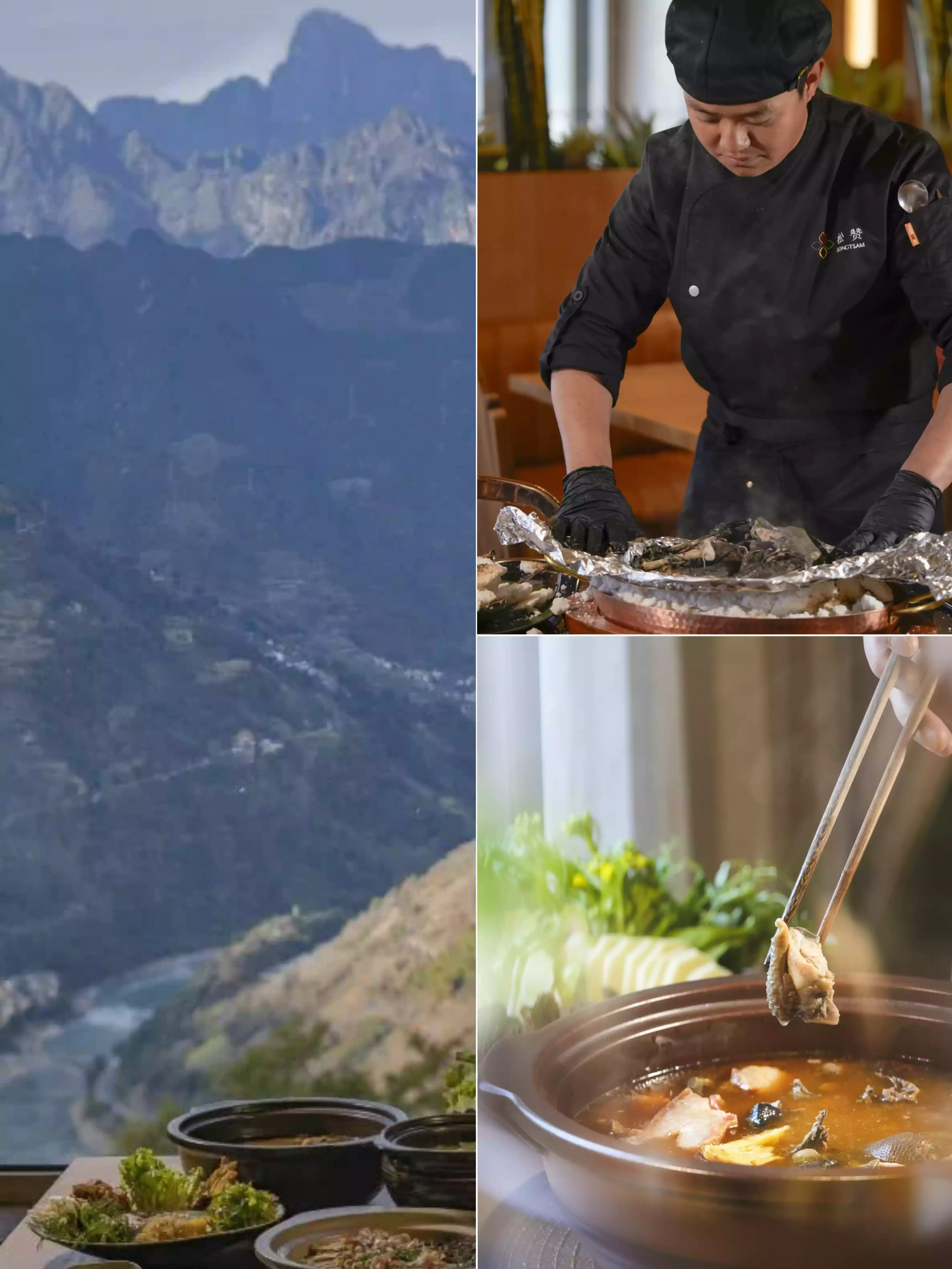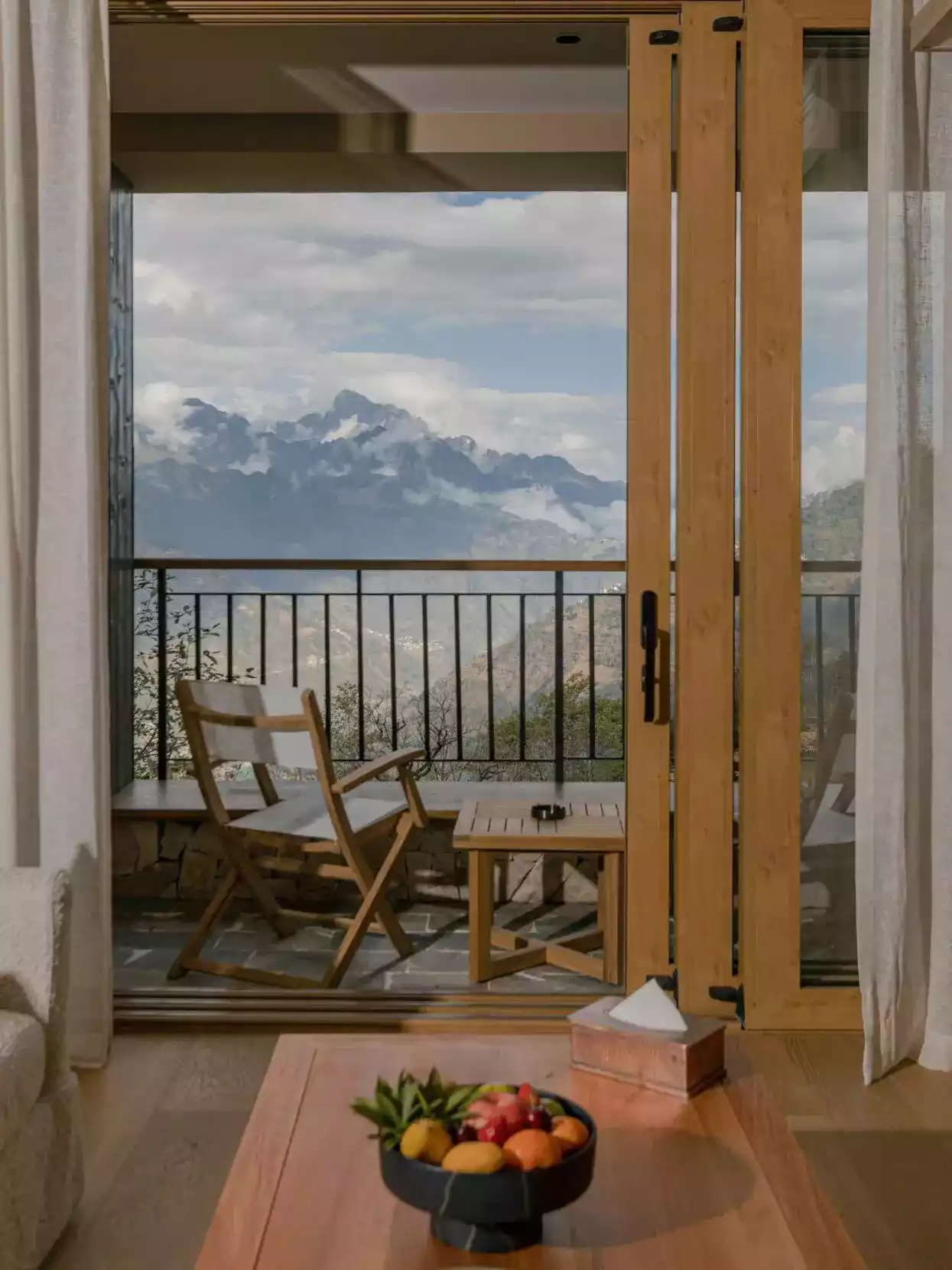 At 8 a.m., I opened the wooden windows to the still-clear morning mist of Gaoligong Mountain. All guest rooms face the Nujiang Grand Canyon. Lying in bed, I gazed upon the sea of clouds, waking to the distant mountains and the morning mist. The vast natural cave of Stone Moon Peak loomed through the mist. On the hotel's wooden terrace, a Lisu waiter set out breakfast: steaming freshly ground buckwheat porridge, paired with local wild honey and butter tea.