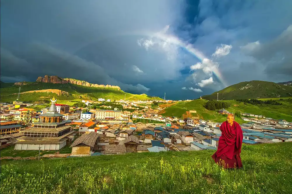 The Golden Summit of Tagong Temple faces the Yala Snow Mountain