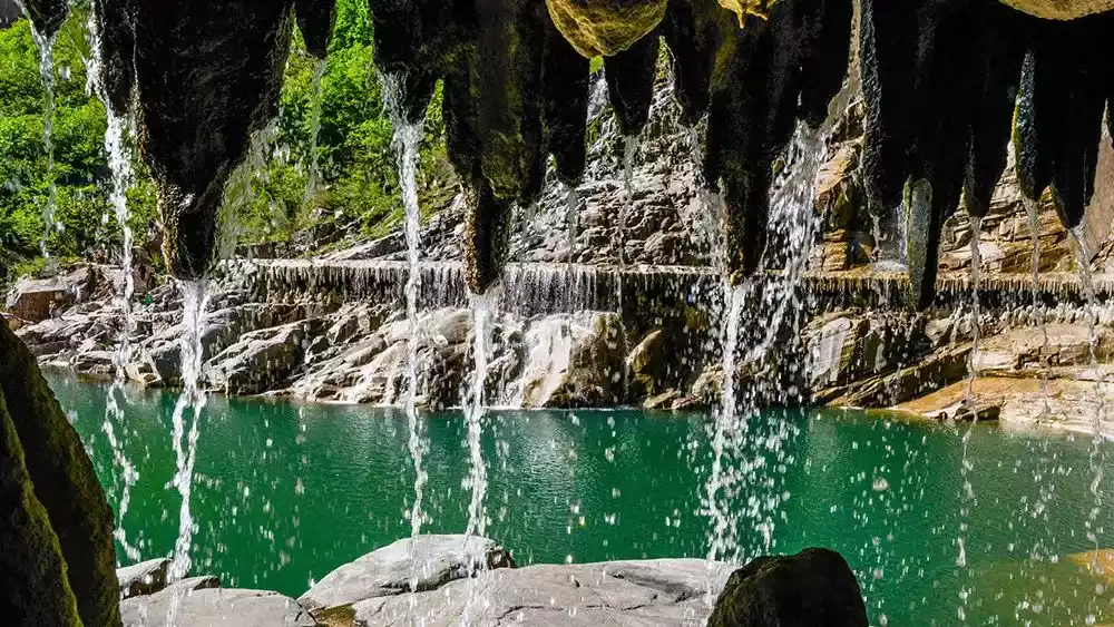 During the flood season, the Tianhegou Waterfall cascades down like a jade belt, roaring and rushing, echoing through the mountains and valleys. The Water Curtain Cave below is remarkably cool, and the cascading water cascades down like a curtain of jade beads suspended from windows formed by stalactites.