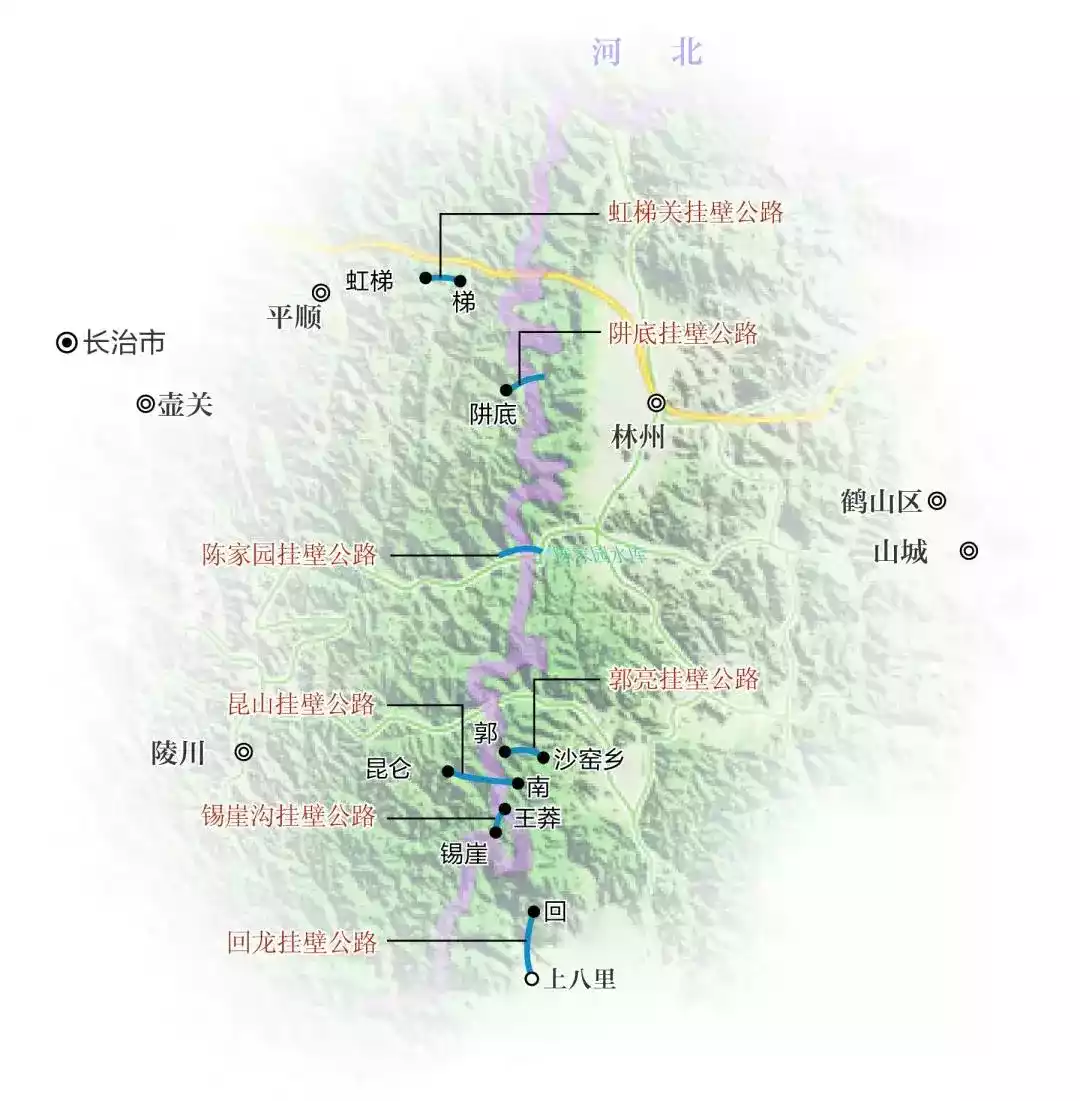 There are 7 existing cliff-hanging roads in the Taihang Mountains, 6 of which are located in the southern Taihang Mountains and 1 in Pingshun County, Shanxi Province, on the edge of the northern Taihang Mountains. They are: