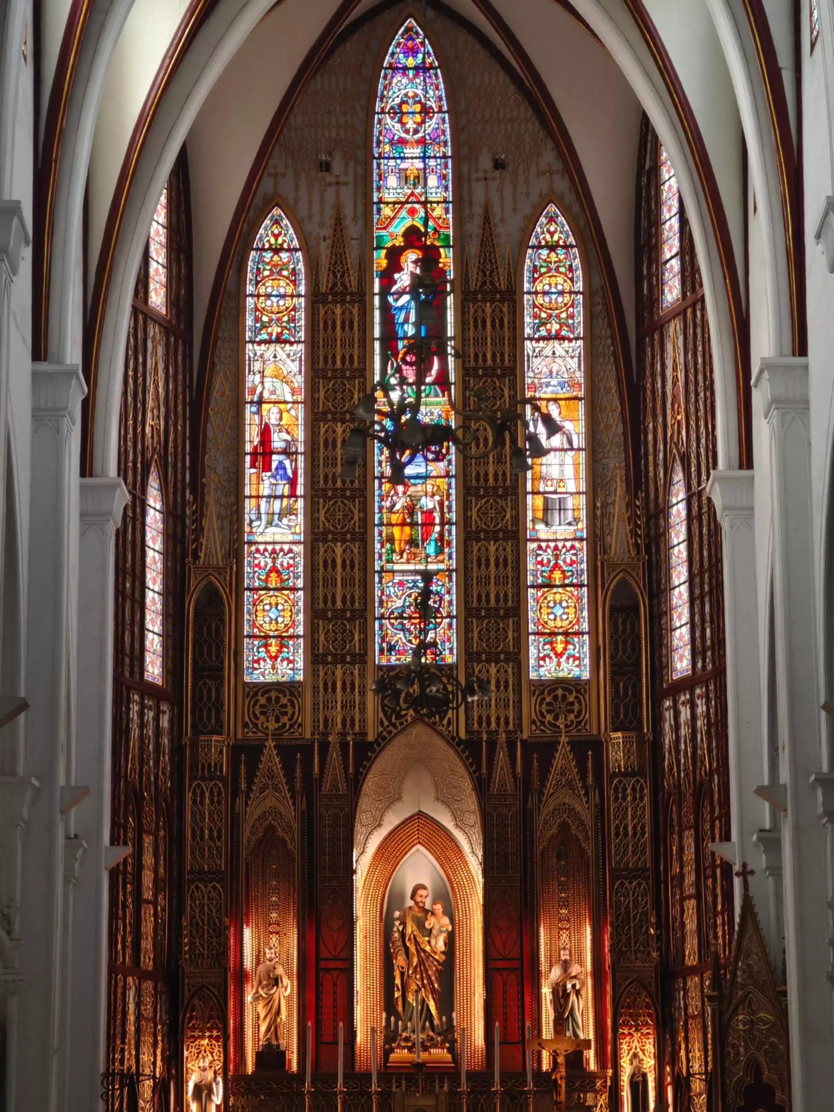 If you look closely, you might also notice that the towers' facades are made of black sandstone, a specialty of North Vietnam, which turns a mossy green during the rainy season. Meanwhile, the interior dome features a "localized" biblical mural depicting the Virgin Mary's face, which bears Southeast Asian characteristics.