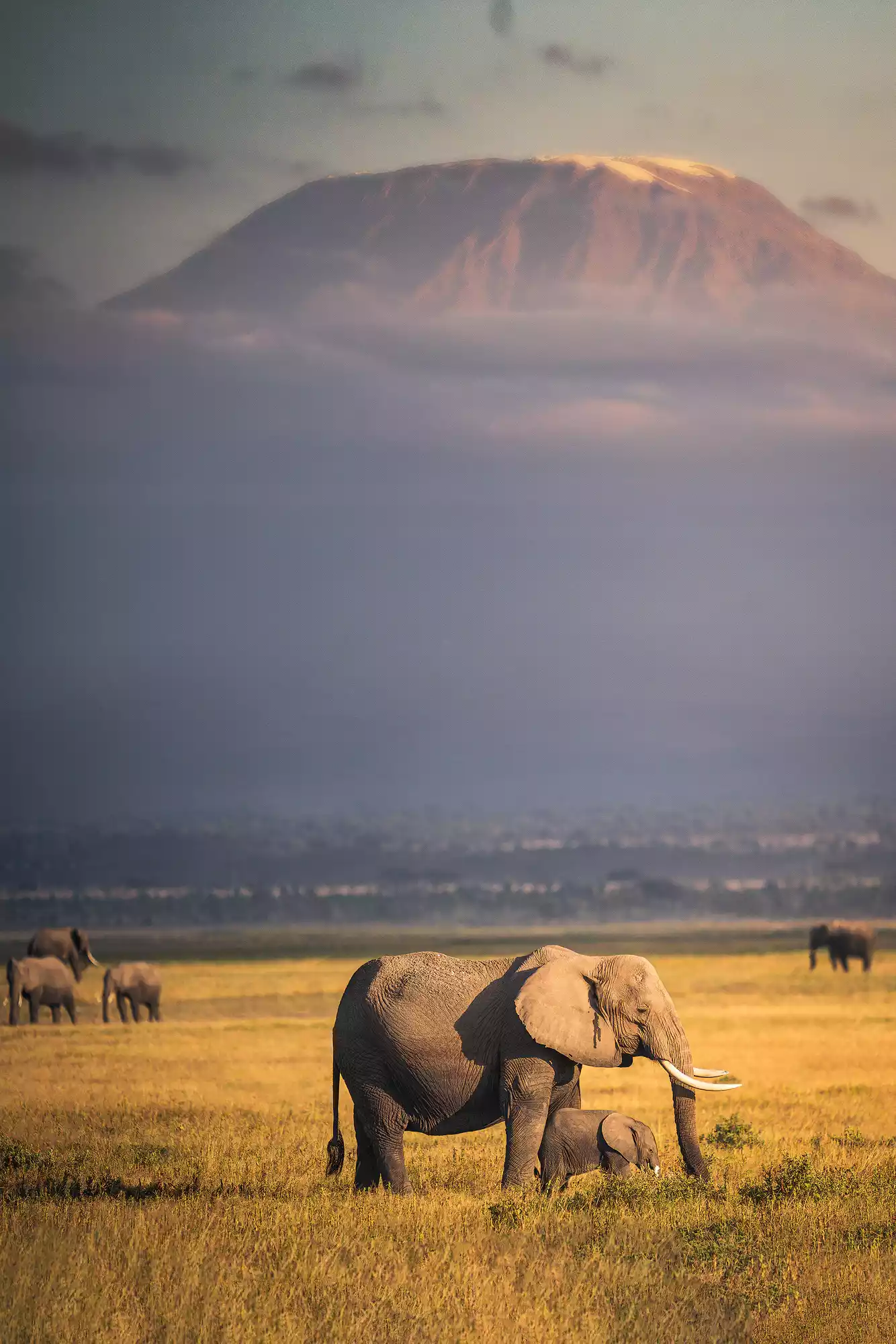 Classic composition of an elephant family at the foot of Mount Kilimanjaro in Amboseli