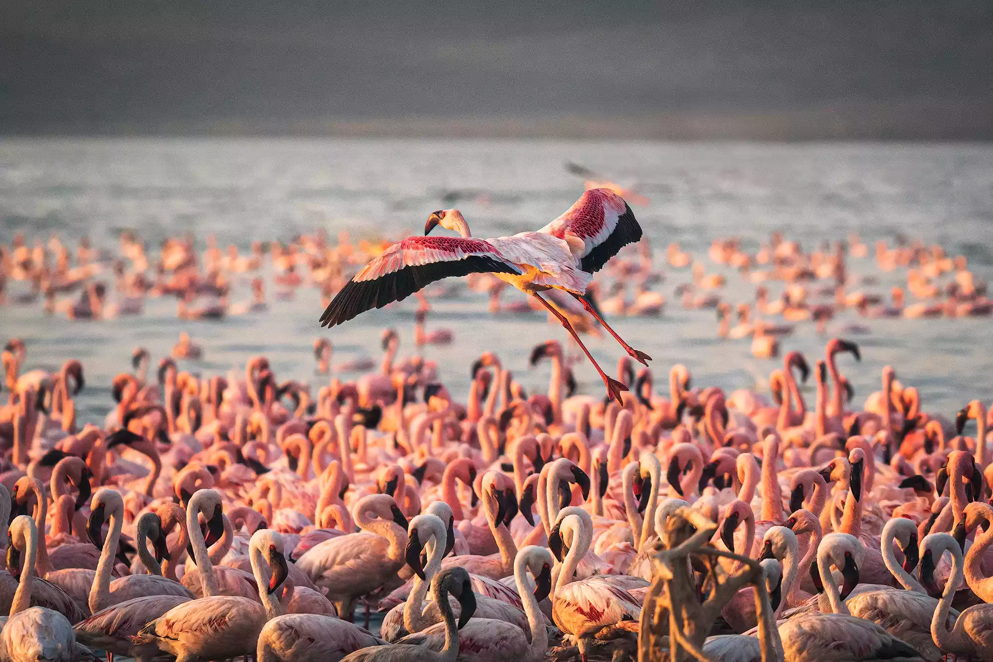 Flamingos fluttering in the sky create a colorful feast of pink sea