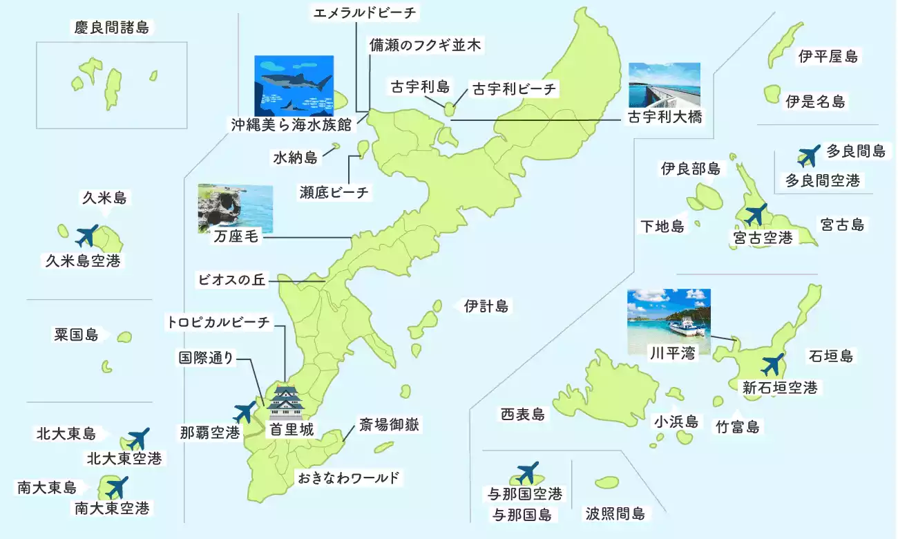 Okinawa Prefecture comprises three large island groups from north to south: the Okinawa Islands, the Miyako Islands, and the Yaeyama Islands. If you're an island enthusiast like me and have some free time, you'll definitely want to explore the unique charm of each island.