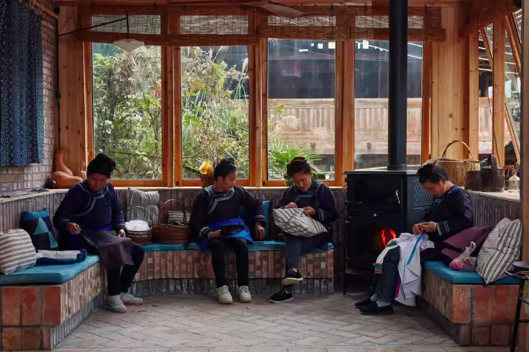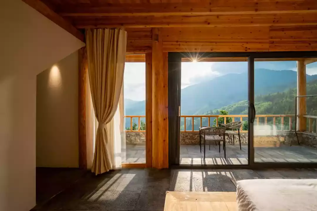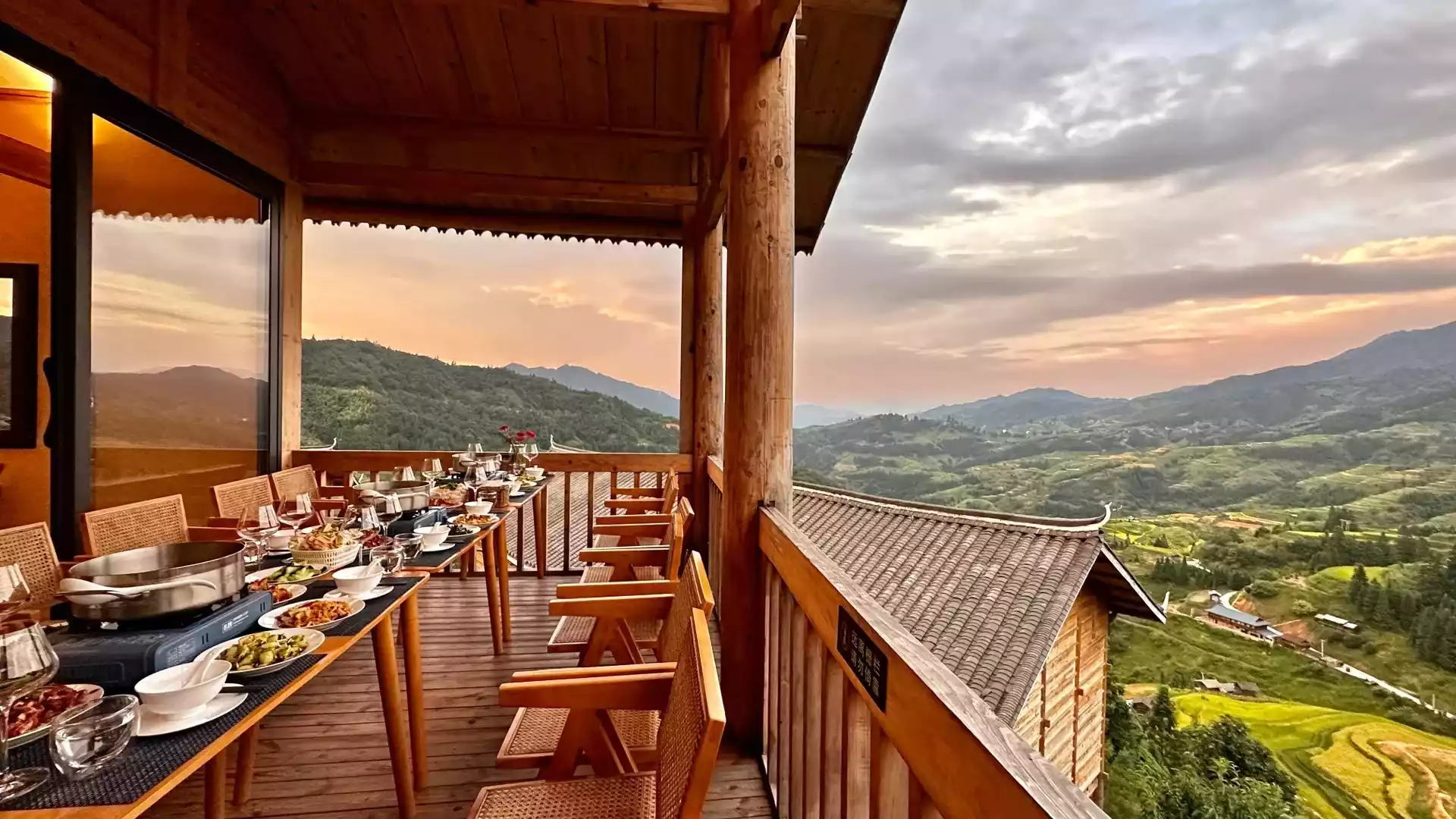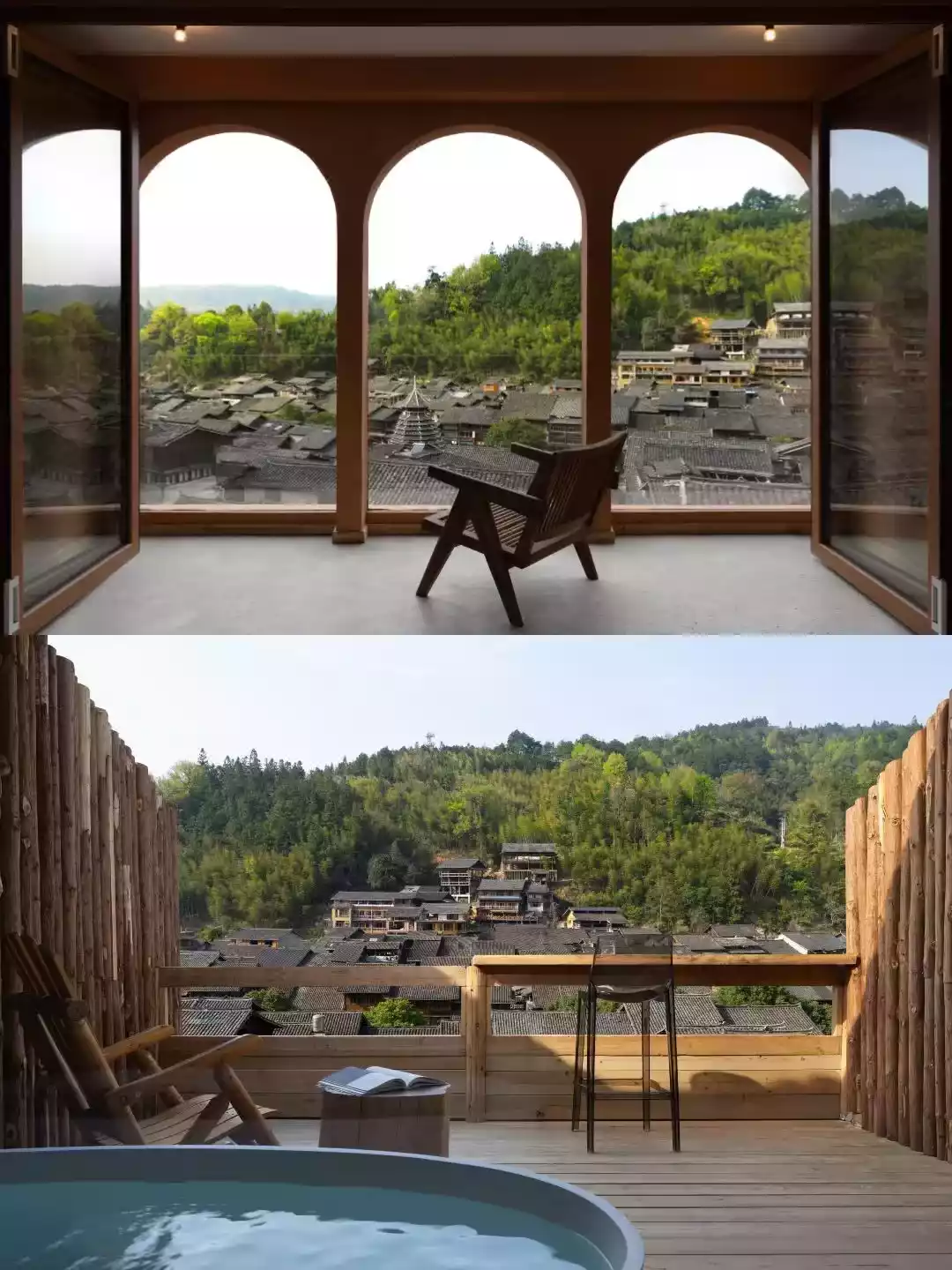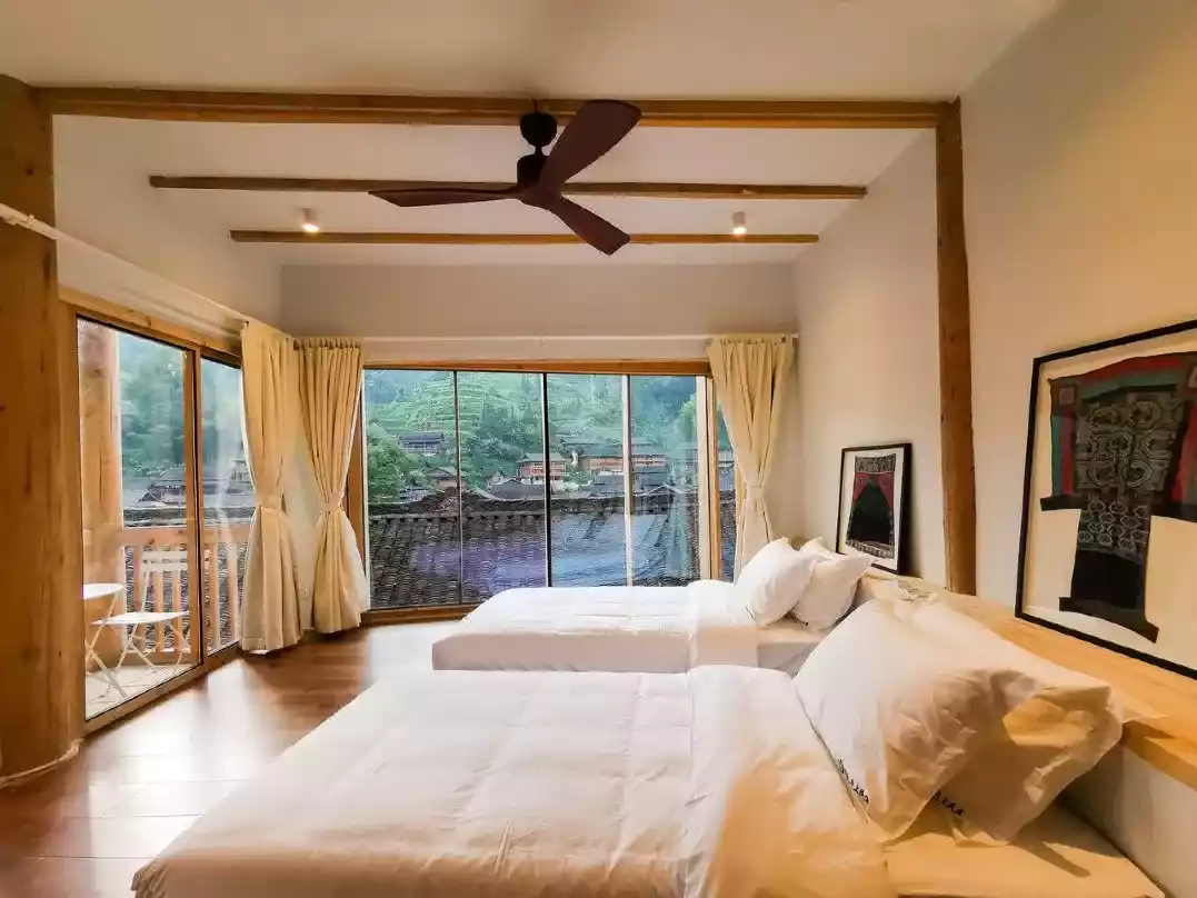 Jingshangjian Jiayi Miao Village (Rongjiang): Renovated from an old Miao residence, nestled on a misty mountain ridge and surrounded by mountains on three sides, it boasts a dedicated yoga studio perfect for morning retreats.