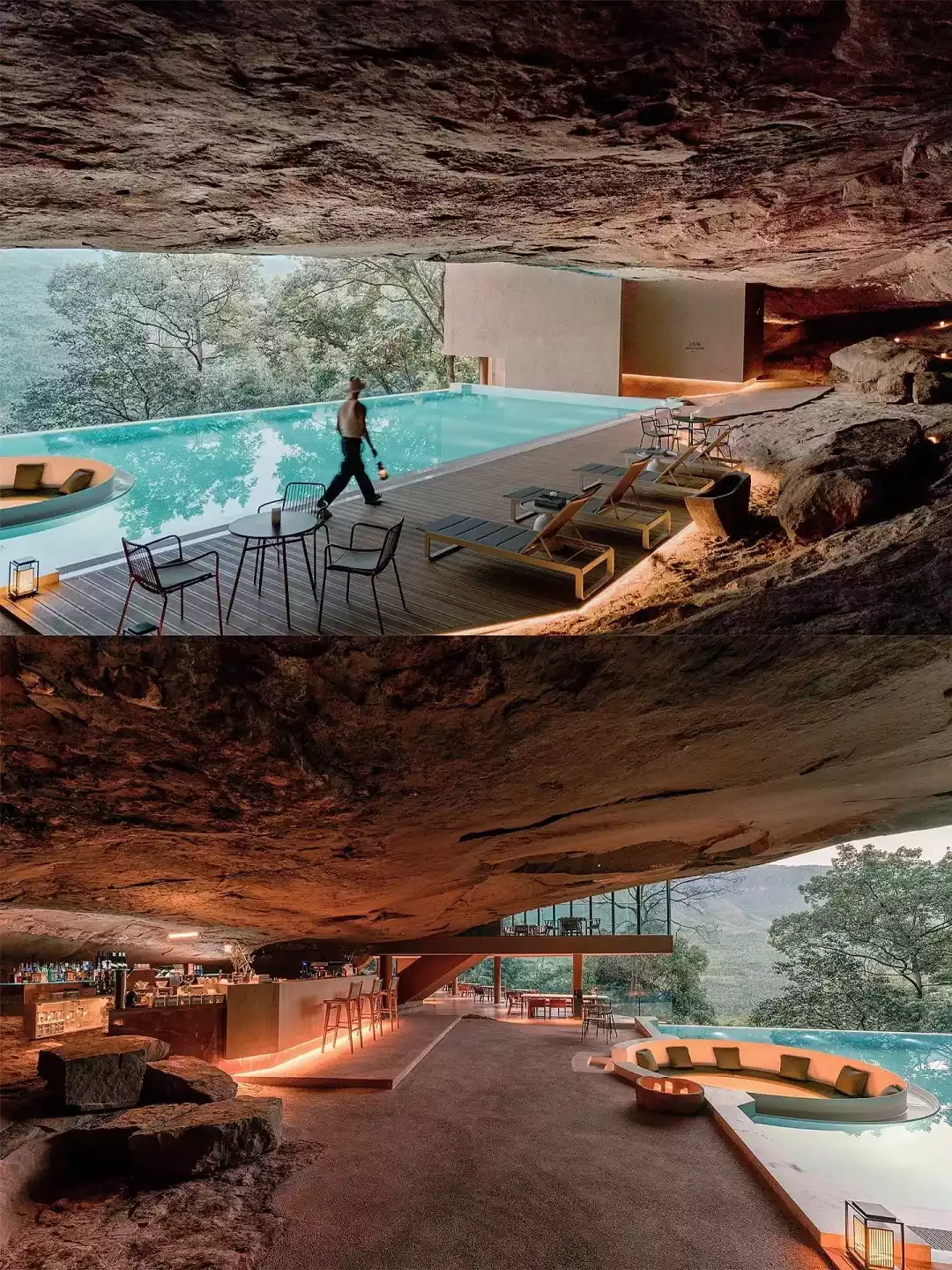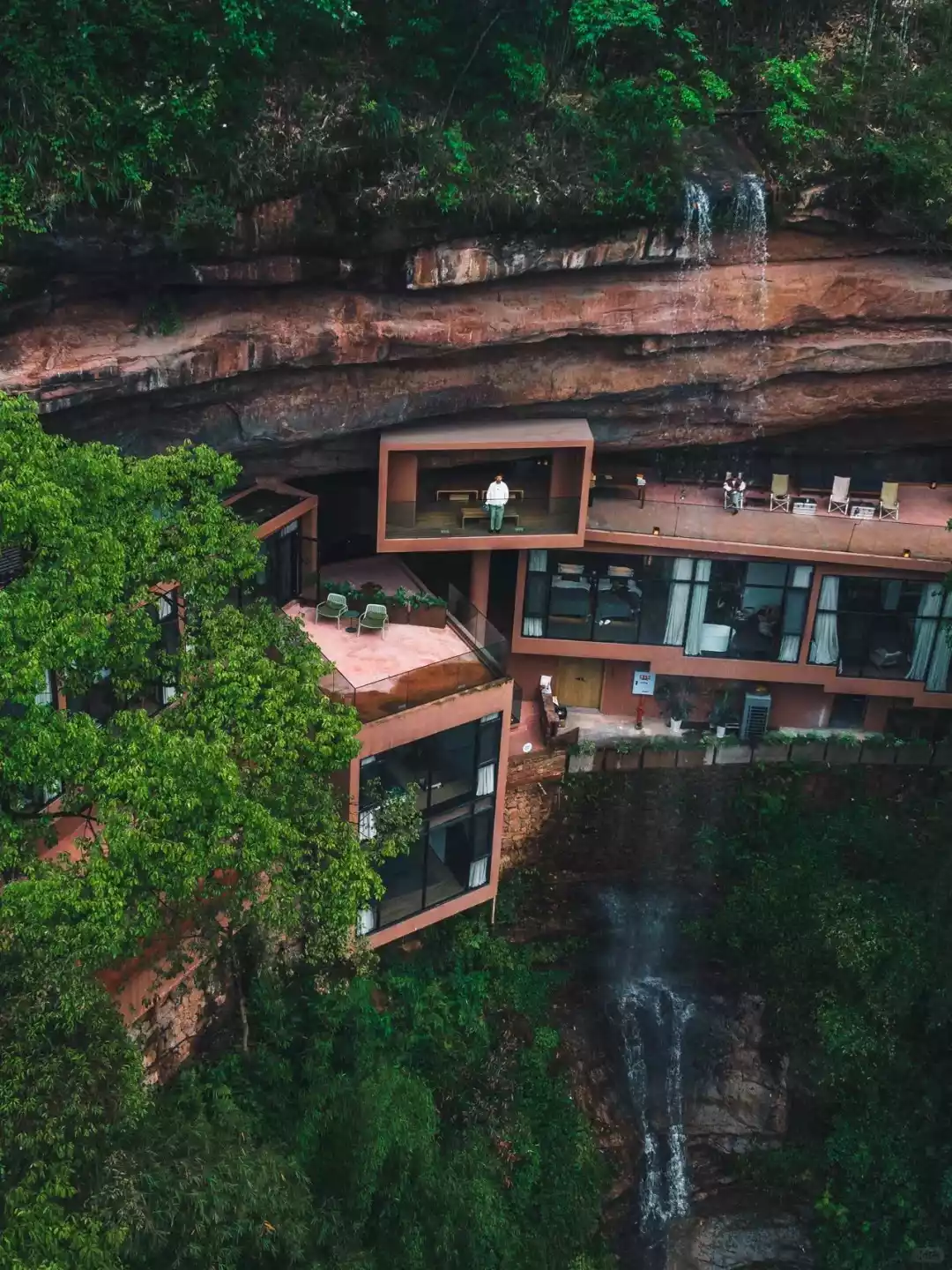 Jianglu Yalugu (Chishui): China's first natural cave waterfall hotel, featuring a wabi-sabi-inspired design. A cascading waterfall, framed by the red cliffs of Chibi, offers a truly magical experience amidst nature.