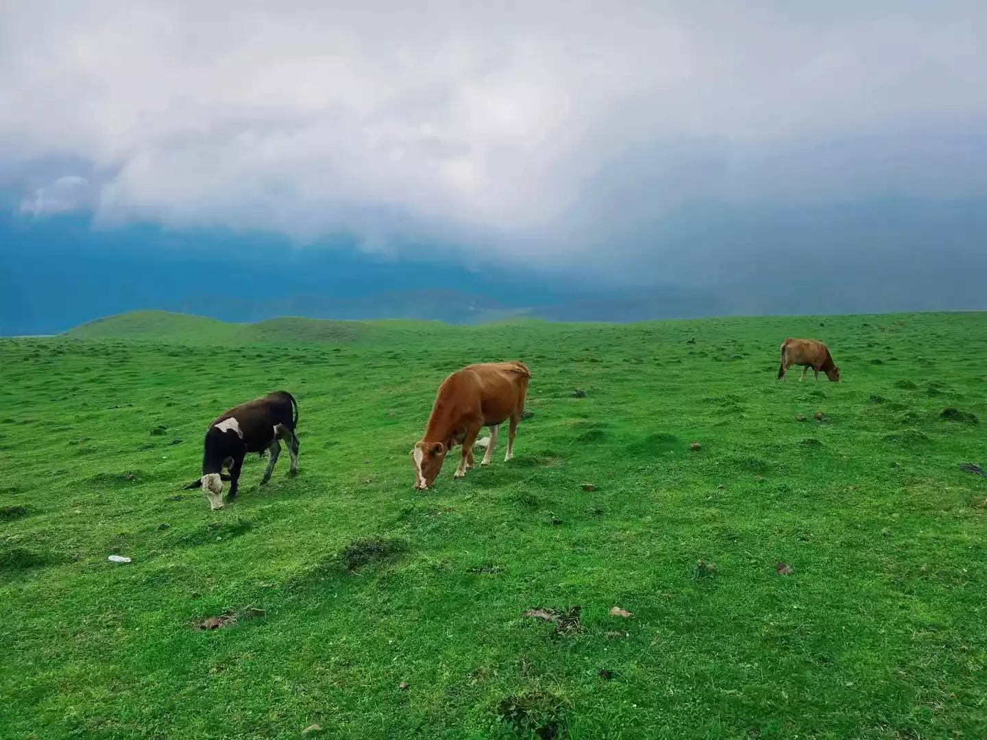 To reach this sky-high pasture, you need to cross layers of lush green mountain ridges. When the last ridge is left behind, the view suddenly opens up to an extremely wide view.