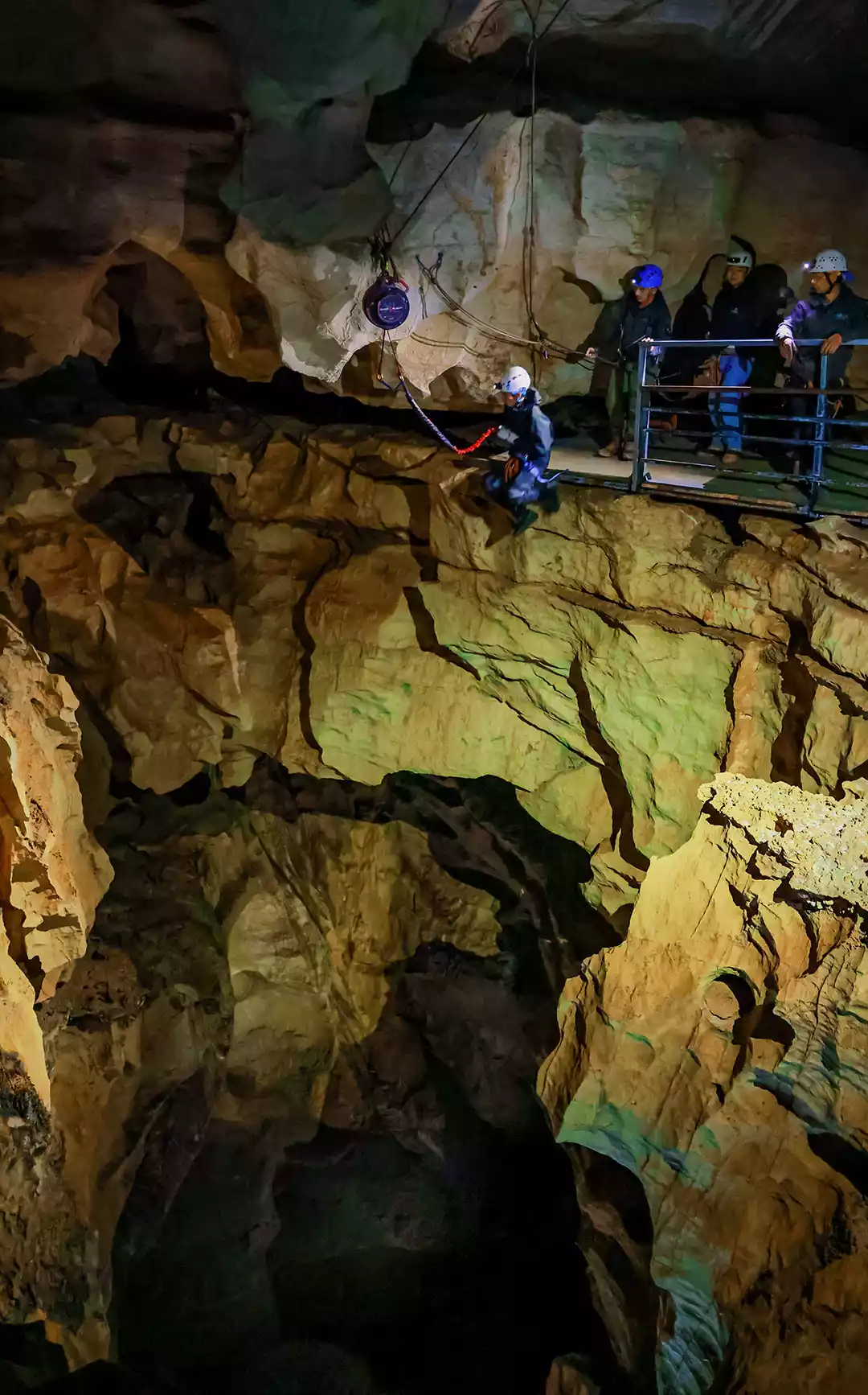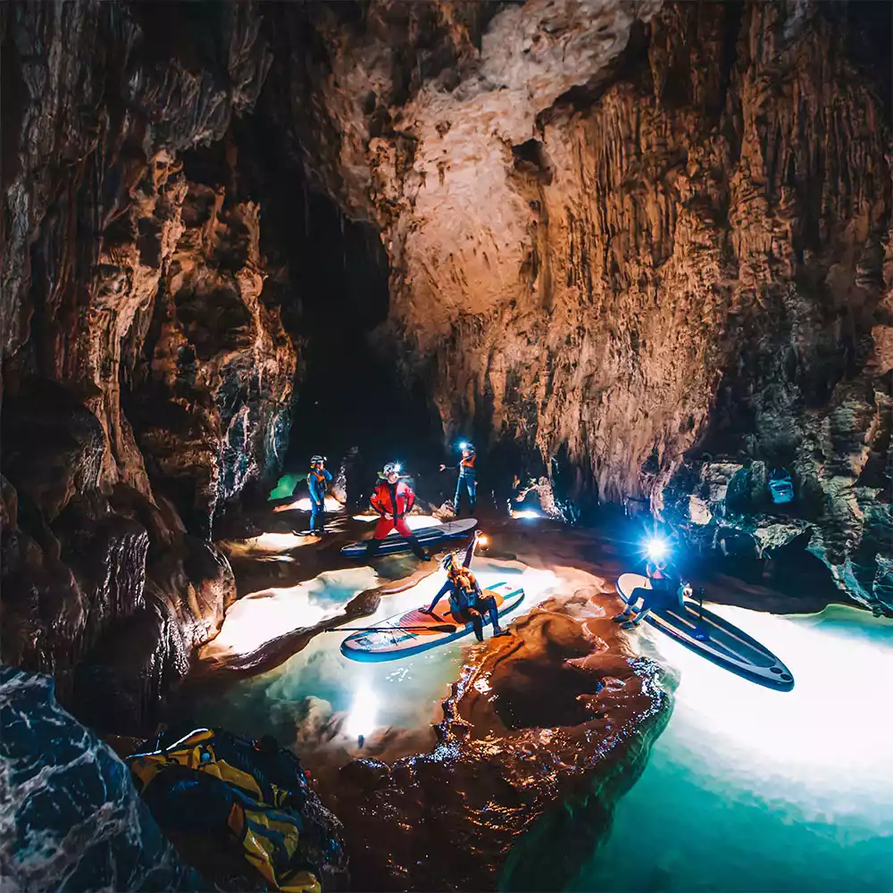 Delve into the Cool Play Forest and journey through the dense forests of Qiannan's mountains. As you break free from the last shroud of shade, you're suddenly suspended in mid-air! Your heart races as you take in the zipline stretching across the caverns, emerald waters beneath your feet, the whistling of the wind in your ears. As you soar into the karst caverns, turn on the lights and witness the magnificent natural labyrinth, carved over millions of years.