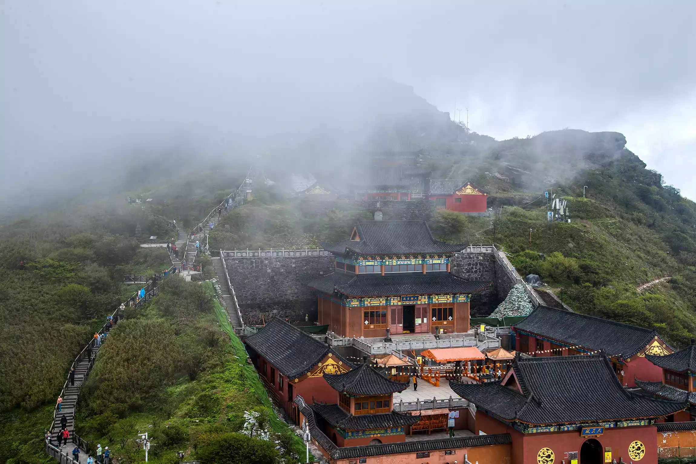 To reach this celestial palace, you'll need to soar through the vast forest via a cable car. Red clouds and golden roofs pierce the clouds, while mushroom-shaped rocks rise majestically into the sky amidst the fierce winds. Two ancient temples hang isolated atop a thousand-foot cliff. A sea of clouds swirls beneath you, while Buddhist chants drift ethereally on the mountain breeze. Standing on the border of the Golden Summit, every step feels like stepping on the edge where the human world meets the heavens. Because of its height, it's incredibly cool—a perfect escape from the summer heat!