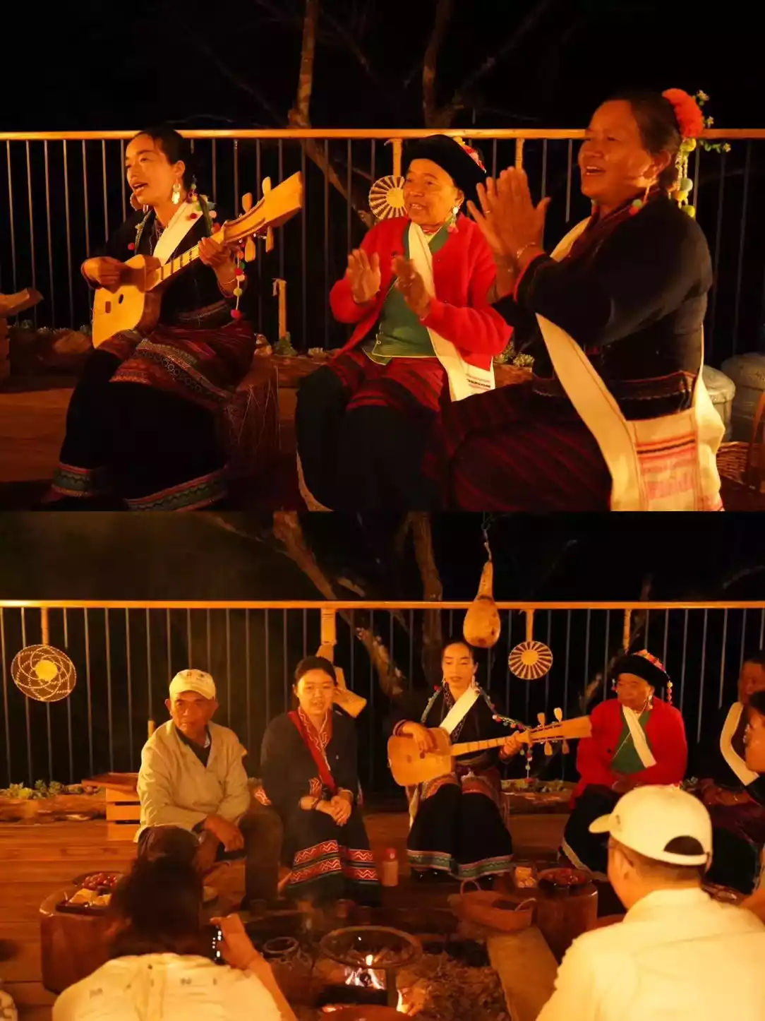 At night, tea is roasted by the fire pit. Everyone sits around the fire pit, listening to the intangible cultural heritage songs of the Bulang girl, listening to the Dai girl talk about the dogs in the village fighting to choose the dog king on the full moon night, and listening to the inheritor grandfather tell stories about the tea mountains.