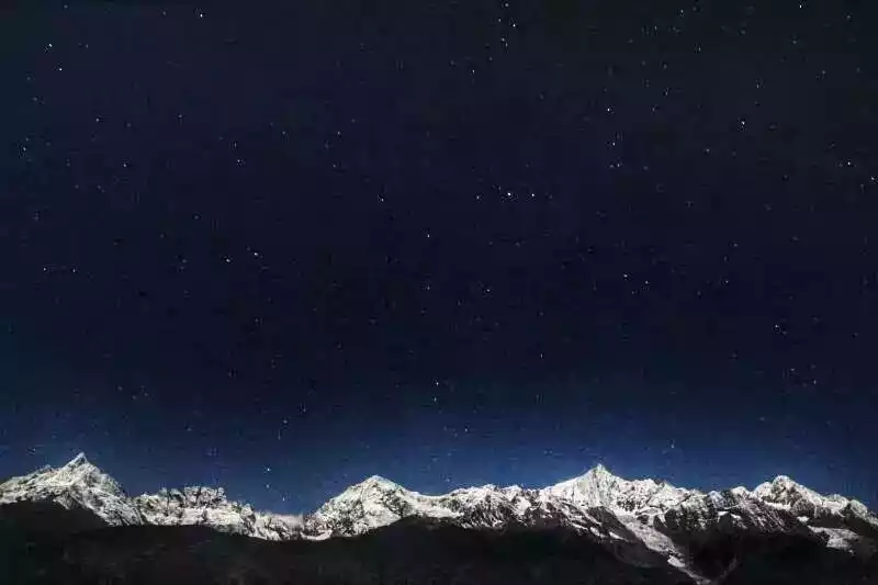 It might have been a full moon that day. When I got up to go to the bathroom at night, the Thirteen Peaks of Meili illuminated by the moonlight made it difficult for me to tell whether it was night or day. The snow-capped mountains were so pure and holy. I immediately went back to the house to get my camera and took this photo.