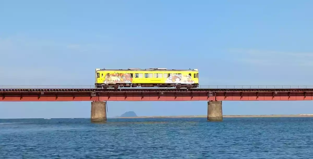 The Kyoto Tango Railway, meandering along the Sea of Japan, offers sightseeing trains like the Aomatsu and Akamatsu, each boasting unique interior and exterior décor and menus. Passengers can savor coffee or dessert while gazing out the large windows at the azure blue waters of Maizuru Bay. As the train crosses the Yuragawa River bridge, it appears to float above the water, reminiscent of a dreamlike scene from Spirited Away.