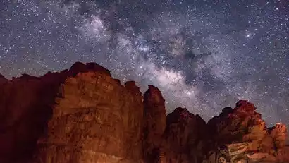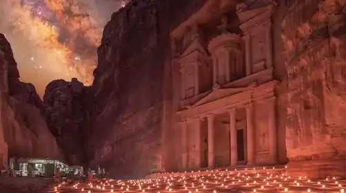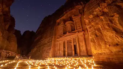 We will then enter the ancient city of Petra for the first time. A UNESCO World Heritage site and one of the New Seven Wonders of the World, this enigmatic ancient city evokes admiration. Carved almost entirely from rock, it is renowned for its vibrant colors. Later that evening, an unforgettable experience awaits: Petra by Night, held only three nights a week. Following the candlelight along the path, we will journey through the narrow, silent, serpentine gorge. Half an hour later, the canyon opens up, revealing the majestic Khazneh Temple, shimmering beneath candlelight and a starlit sky. The night watchmen's song will echo, and above it, you'll hear the subtle melody of candlelight flickering, wind blowing, and meteors streaking by. Afterward, we'll check into our hotel near Petra for the night.