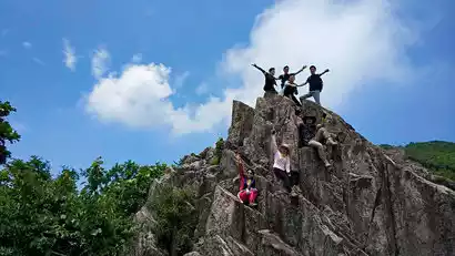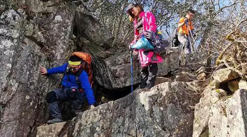 point of the hike at 06:00. After a group warm-up, we started to climb the mountain, using our hands and feet to climb up along the trail to Yangtianping.