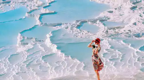 After touring the ancient city, let's head to Pamukkale. After removing our shoes, we'll walk down from the top of the mountain, gradually following the path to the pool. The water here is hot springs, so even walking barefoot won't feel cold. The blue water blends with the white Pamukkale, creating a truly dreamy experience. After removing our shoes, we'll walk down from the top of the mountain, gradually following the path to the pool.