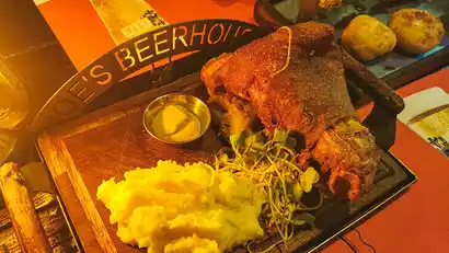 After filming, we headed to the renowned local restaurant Joe's Beerhouse for a welcome meal of German pork knuckle. This German-owned restaurant, featured on the popular variety show "Flowers and Youth," is a popular spot and bustling with people from China and abroad, enjoying the lively atmosphere. After dinner, we checked into our hotel to rest.