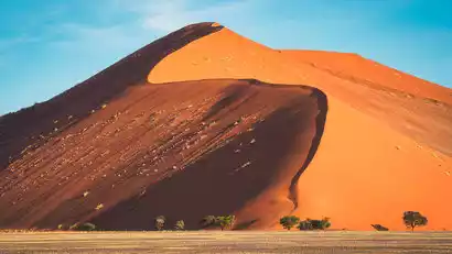 After breakfast, we'll depart for a photoshoot in the Sossusvlei Desert. Within the vast 54,000 square kilometers of the Namib Desert, the Sossusvlei Desert stands out as a striking sight. Its towering crimson dunes contrast beautifully with the blue sky and white clouds, creating a stunning photo opportunity that's sure to draw countless likes, no photo editing software needed.