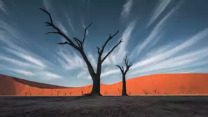 Get up early and transfer to a four-wheel drive off-road vehicle in the Red Desert Scenic Area to visit the Namib Desert's unique wonder of life, the Death Basin, to photograph the thousand-year-old trees.