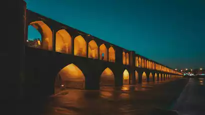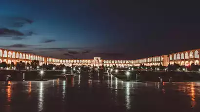 We'll then visit the Haju Bridge, built in the 17th century during the Safavid period, with former royal gardens on either side. We'll then visit the Thirty-Three Arch Bridge over the Zaindrut River. Built in 1602, it's 298 meters long, double-decker, and features 33 arches. At night, the illuminated arches are even more stunning. This iconic brick and stone bridge spanning the Zaindrut River remains beautiful and functional for 600 years, and its captivating night view is truly captivating.