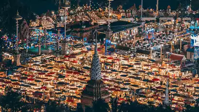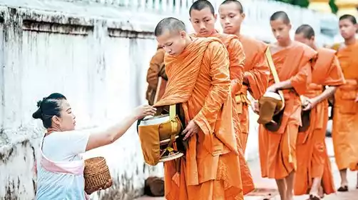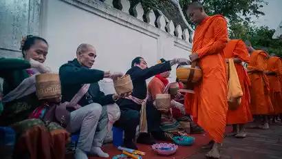 在琅勃拉邦有一个神圣的传统【布施】:每日清晨,僧人们会排成一行,一个个赤脚带着钵走上街头,而在路边静静等候的当地百姓则会准备好食物、果蔬,采用跪立姿势,双手恭敬合十,当僧人走到旁边,布施者会虔诚地将米饭放进钵中,随后僧人们行礼、诵经、远去。我们将成为布施者中的一份子,在这个过程里感受这种纯粹的喜悦。