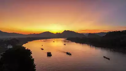 Arriving in Luang Prabang, the cultural center of Laos, the former capital of the Lan Xang Kingdom and a UNESCO World Heritage Site, and settling in, we'll head to the Mekong River, a major Southeast Asian river system. Board a slender boat and watch the sunset amidst the rippling waters. The lingering light of the setting sun casts a shadow over the river and the boat, immersing us in the slow-paced pace of Southeast Asian life. As dusk falls, local vendors flock to the streets, stringing wires and setting up tents. A common commuter street instantly transforms into a bustling night market, where a variety of snacks, bags, leather goods, handicrafts, and T-shirts fill the streets. Let's immerse ourselves and lose ourselves in the excitement.