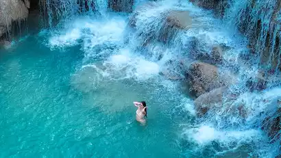 After lunch, we'll head to the renowned Kuangsi Waterfall, a vast, multi-tiered waterfall rising 100 meters in height. The torrent cascades down from a limestone peak, cascading through layers of limestone like a magnificent painting before emptying into a deep, dark green pool below. We'll then journey through a short stretch of pristine rainforest, lush with vegetation and winding paths. The three tiers of the waterfall cascade into a series of shimmering blue-green pools. A popular activity here is tree rope diving. Don't rush out; enjoy a quiet, complimentary fish spa in the water, a chance to connect with nature.