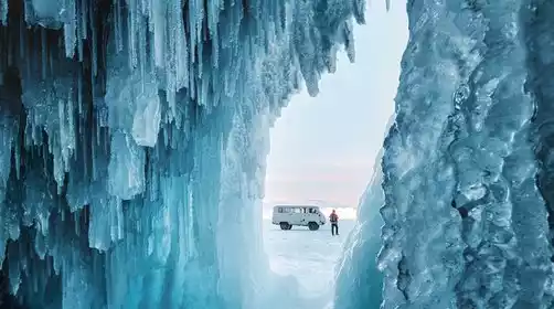 After lunch, we will continue our tour. The driver and tour guide will lead the tourists to have fun on the ice. In the evening, we will come to the area where the ice bubbles are densely packed to enjoy the sunset on the southern front of Olkhon Island.