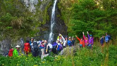 Arrive at the starting point around 1:30 PM, warm up, and then set off! Enter the first large stone gate and ascend the ancient trail from Likeng (580 meters) to Fuquan Village (885 meters). This easy hike involves passing through ten gates and several waterfalls. It takes about 2.5 hours.