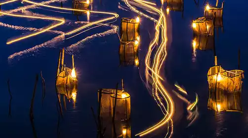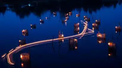 Shrimp lanterns are a traditional fishing method still practiced by Kinh fishermen. They place shrimp cages at the estuary and, after dark, light oil lamps on them to lure shrimp into the cages for harvesting. To facilitate boating and restocking, these cages form a beautiful array on the river. Under the cover of night, the fixed bamboo poles of the cages, the translucent cages, and the quietly flowing river create a unique landscape blending humanity and nature along the seawall.
