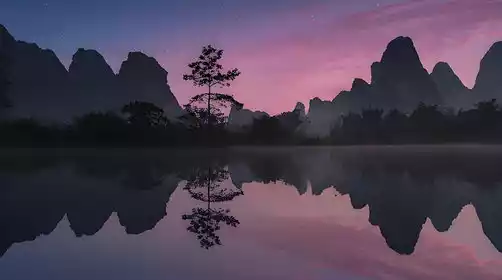 Get up early to photograph the sunrise over the peaks and forests of Quyang Lake