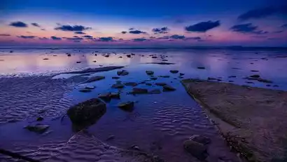 Wucai Beach is a prime spot for sunrise photography in Weizhou, boasting a vibrant mix of sea cliffs, platforms, and caves. As the sun rises from the east, the morning light casts a shadow over the volcanic rock formations and reefs, creating a vibrant contrast against the vibrant sky and sea, creating a breathtaking volcanic sunrise.