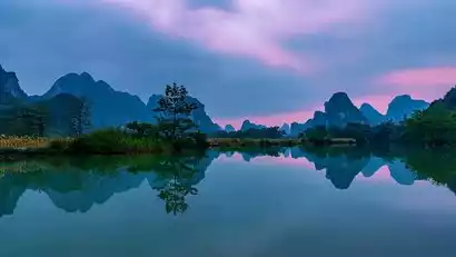 Quyang Lake is a karst plateau lake, known as "Guilin on the Water" and "China's Halong Bay". In the early morning, the surface of Quyang Lake is misty and vast, with more than 10 peaks of different sizes scattered in the lake, reflected on the mirror-like water surface, making Quyang Lake even more charming.
