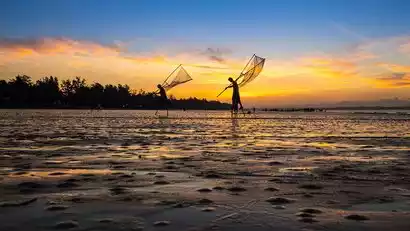 Get up early to photograph the sunrise on Golden Beach and watch the Kinh people fishing on stilts